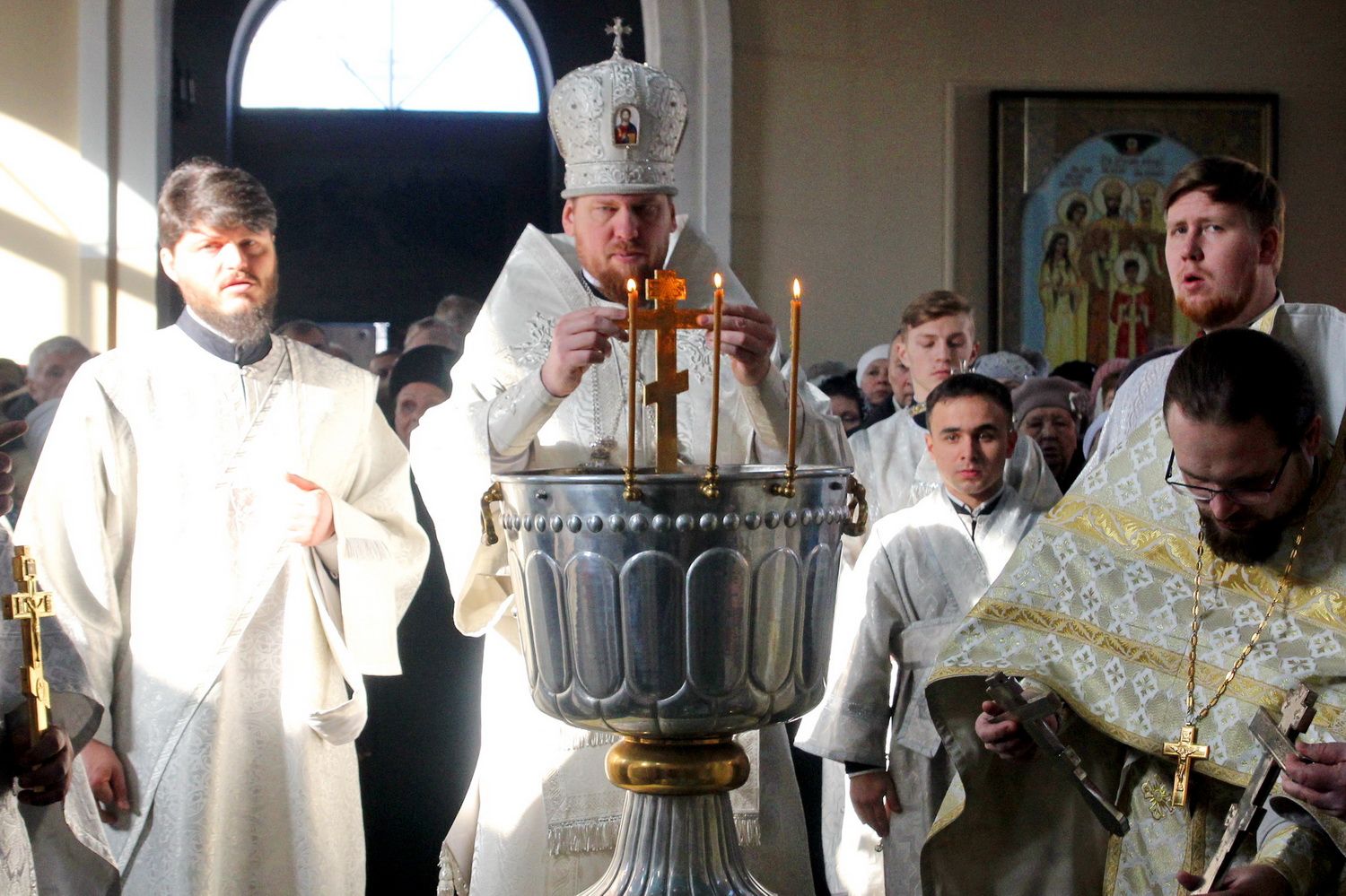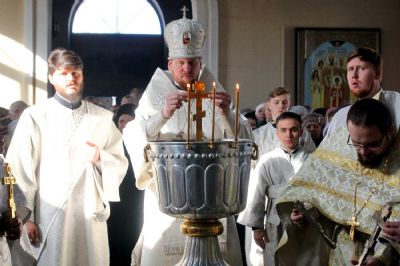 По заамвонной молитве при пении тропарей «Глас Господень на водах» священнослужители вышли в центр храма, где митрополит Владимир совершил чин великого освящения воды, после которого окропил верующих святой водой.