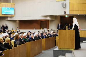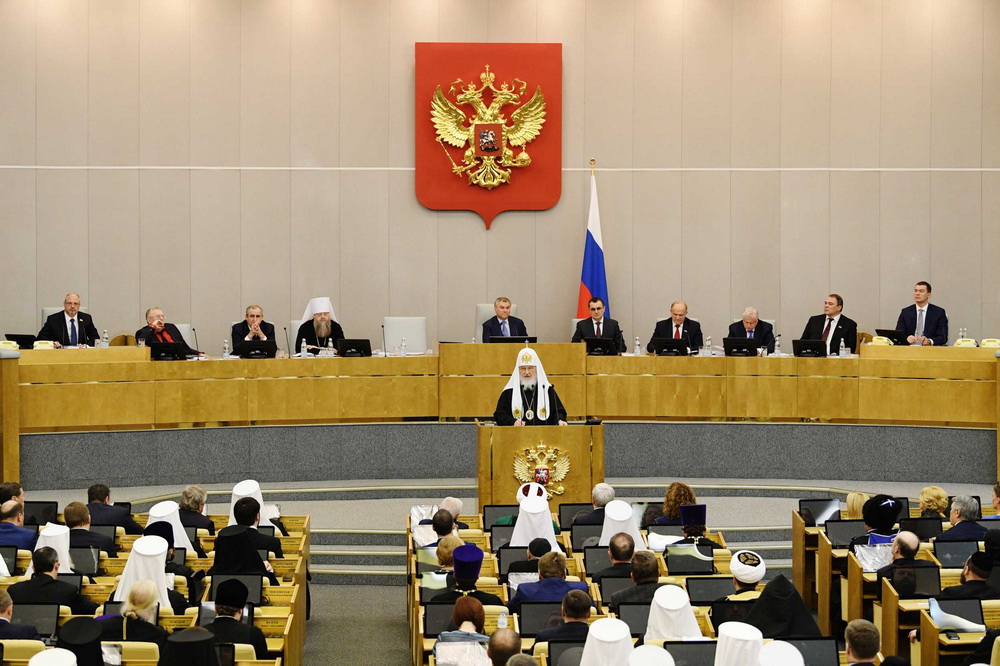 «Церковь не является политической партией и вообще не входит в политику как некий субъект. Но все, что происходит в стране, близко к Церкви. Она несёт ответственность перед Богом и перед историей за состояние душ человеческих, и потому вопросы, которыми вы занимаетесь, затрагивают, несомненно, и церковную повестку дня. Не входя во всю сложность того, чем занимается Государственная Дума, я все-таки попытаюсь обозначить наше отношение к некоторым вопросам, которые, на мой взгляд, являются важными», — отметил Предстоятель.