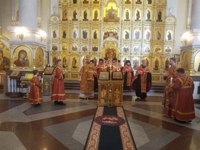 Его Высокопреосвященству сослужили: ключарь собора протоиерей Александр Талько; протоиерей Константин Чунчук, протоиерей Сергий Шуталев, игумен Антоний (Каменчук), игумен Тихон (Иршенко), иеромонах Иоанн (Костин). Богослужебные песнопения исполнил Митрополичий хор Покровского кафедрального собора под управлением регента Людмилы Макаренко.