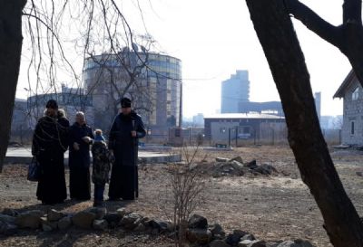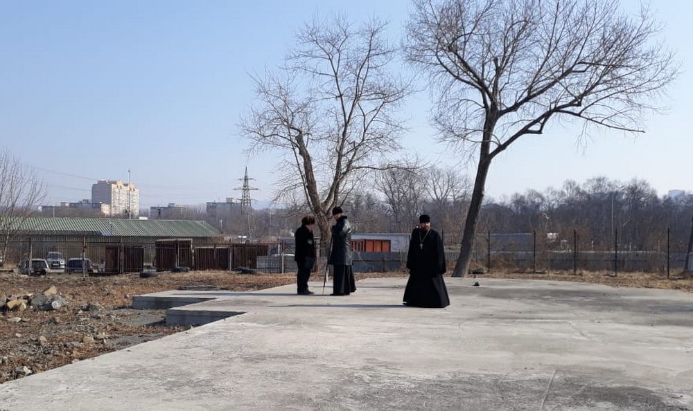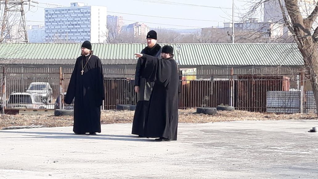 По окончании Богослужения протоиерей Димитрий Федорин и митрополит Владимир осмотрели фундамент будущего храма в честь иконы Божией Матери "Всех скорбящих Радость".