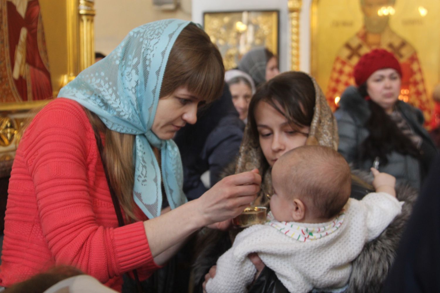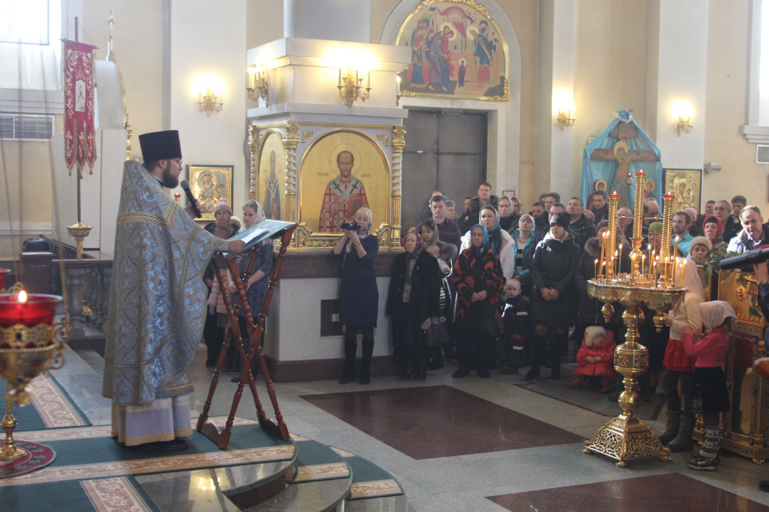 Проповедь после запричастного стиха произнес иерей Максим Точуков. Таинство причастия совершалось из пяти чаш. Затем священнослужители совершили славление празднику Сретения Господня.