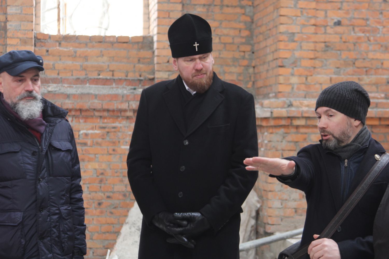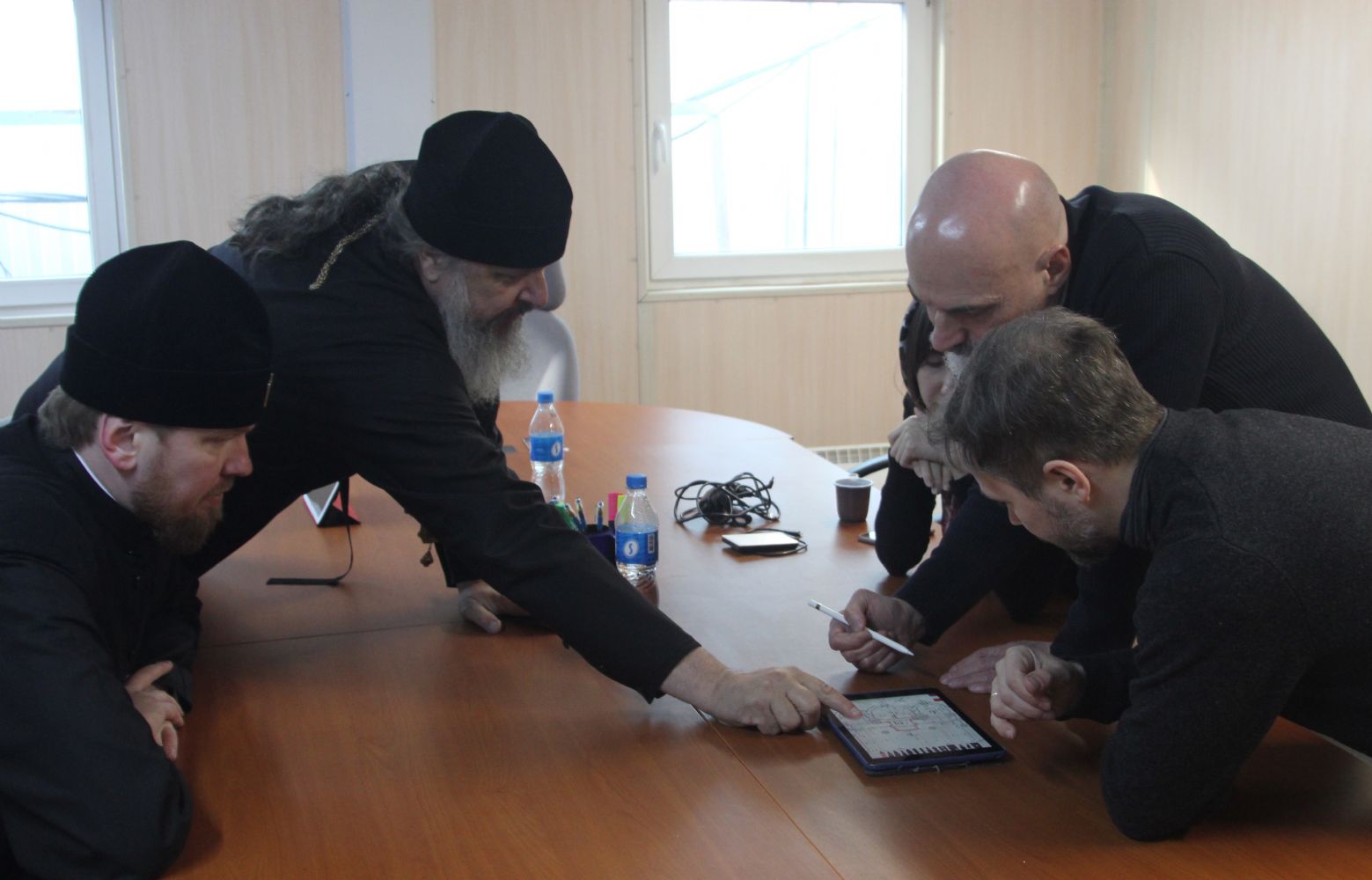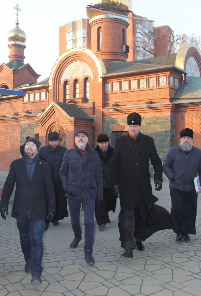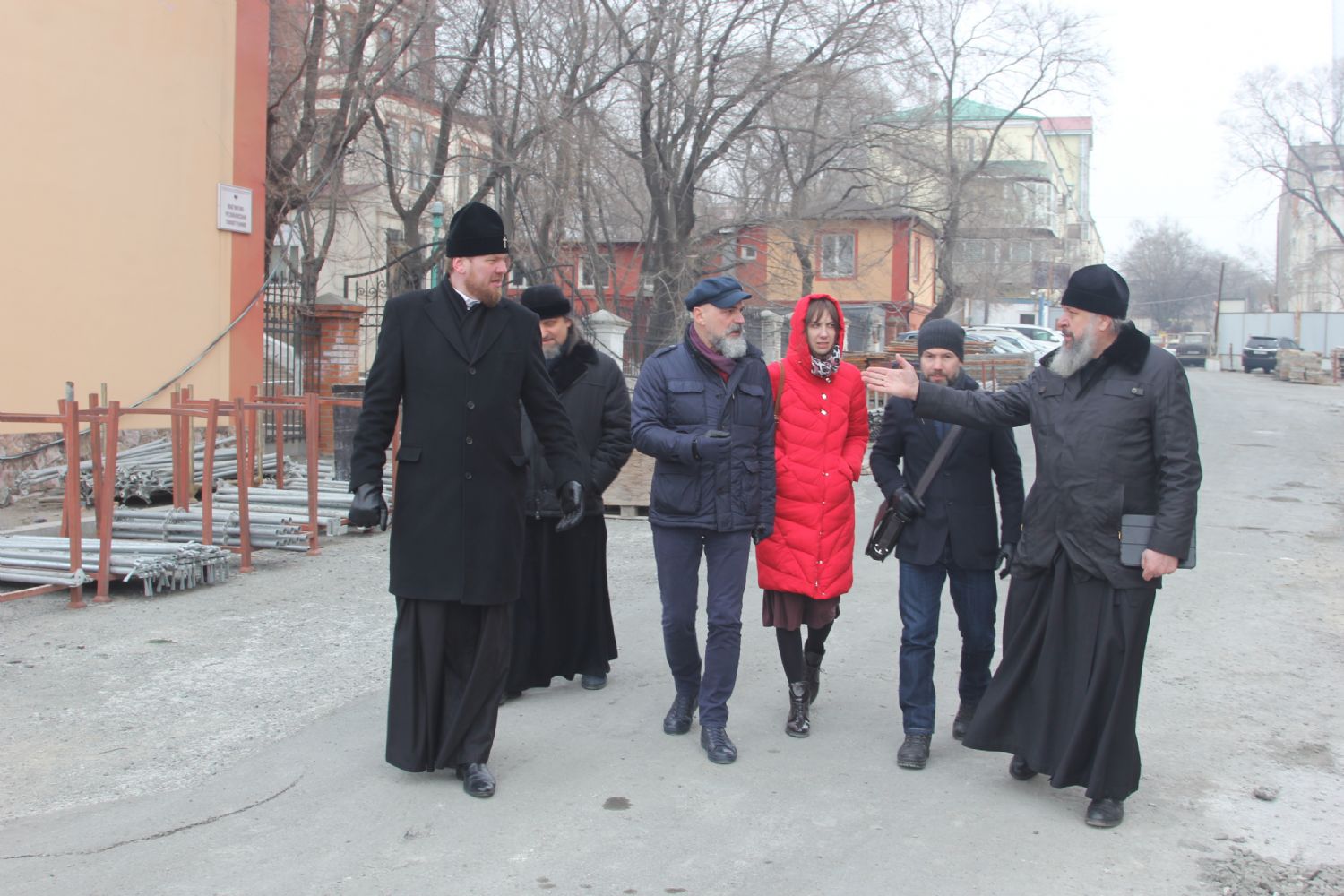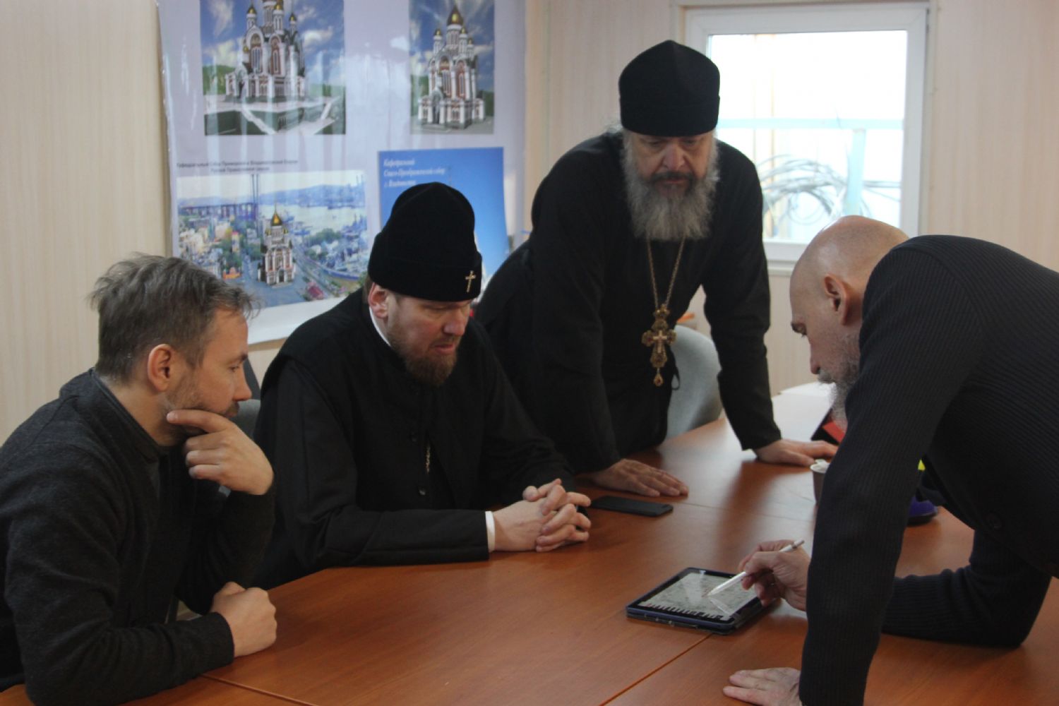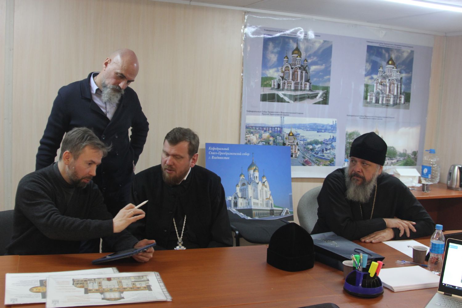 Владивосток. 20 февраля 2019 года митрополит Владивостокский и Приморский Владимир на строительной площадке Спасо-Преображенского кафедрального собора встретился с известным архитектором, руководителем творческого объединения «Товарищество реставраторов. Мастерские Андрея Анисимова» Андреем Альбертовичем Анисимовым и группой архитекторов и художников, занимающихся благоукрашением храмов по всей России.