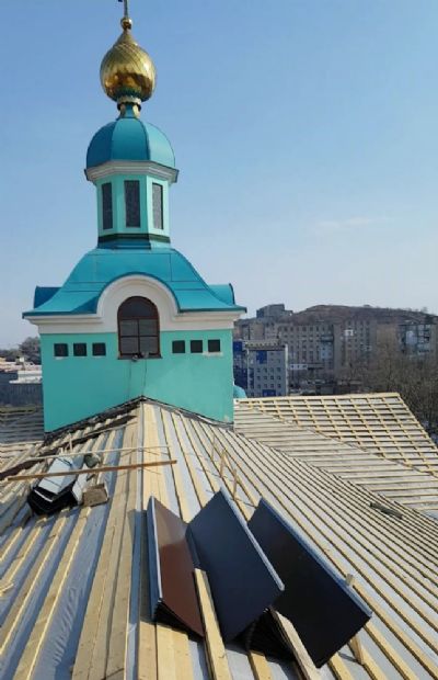 Владивосток. В храме Казанской иконы Божией Матери приступили к реконструкции крыши — бригада рабочих уже разобрала старую кровлю и заменила обветшавшую обрешетку на новую. Основные работы планируют завершить в течение двух ближайших недель. «Обновление кровли обеспечивают благотворители, но каждый имеет возможность внести свою лепту в это благое дело», — отмечают на приходе.