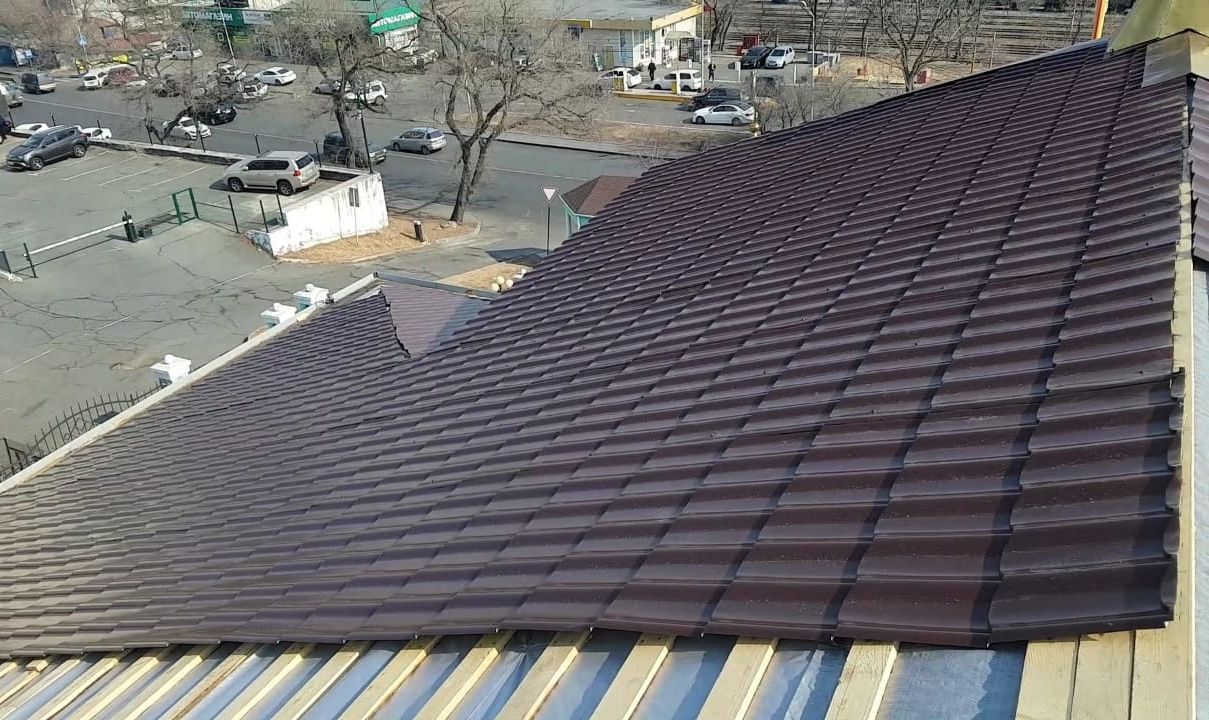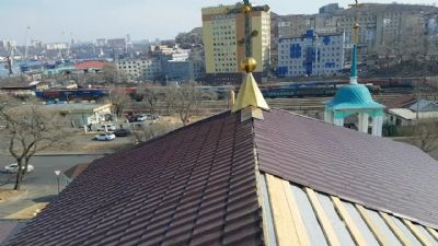 Сейчас начат монтаж непосредственно кровли. В качестве облицовочного материала рабочие используют металлочерепицу, все фасонные детали которой уже изготовлены. Как отмечают строители, замена кровли на храмовом здании —процесс достаточно специфический, поскольку требует работ с фасонными элементами и нестандартными деталями.
