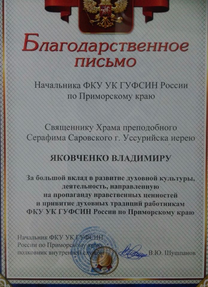 Духовно-просветительскую беседу посетил полковник внутренней службы В.Ю. Шушпанов, начальник Федерального казенного учреждения «Управление по конвоированию» Главного управления Федеральной службы исполнения наказаний по Приморскому краю. Валерий Юрьевич вручил священнику Владимиру Благодарственное письмо ― за вклад в развитие духовной культуры и совместное сотрудничество.
