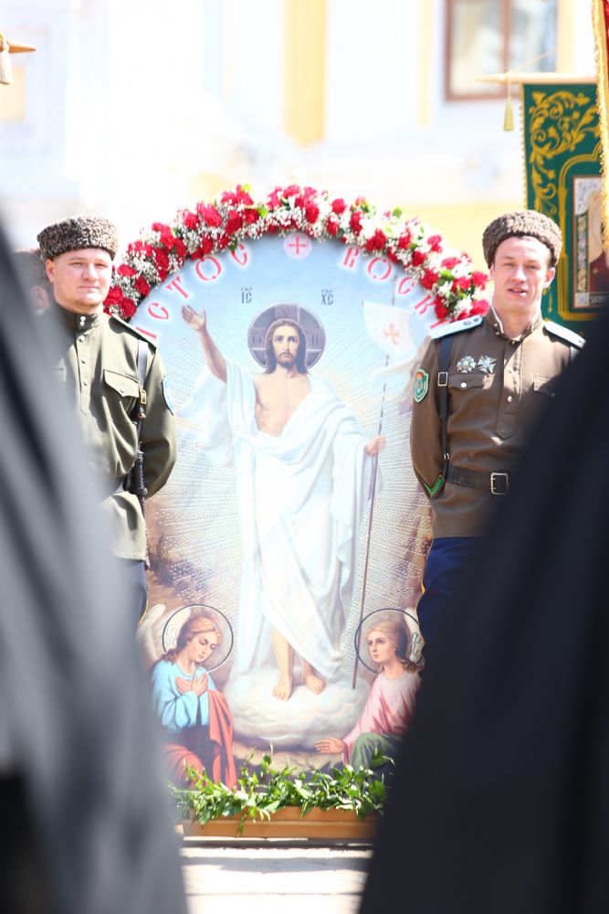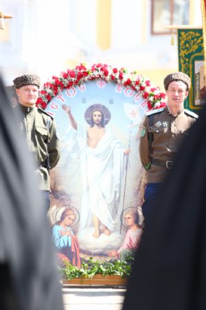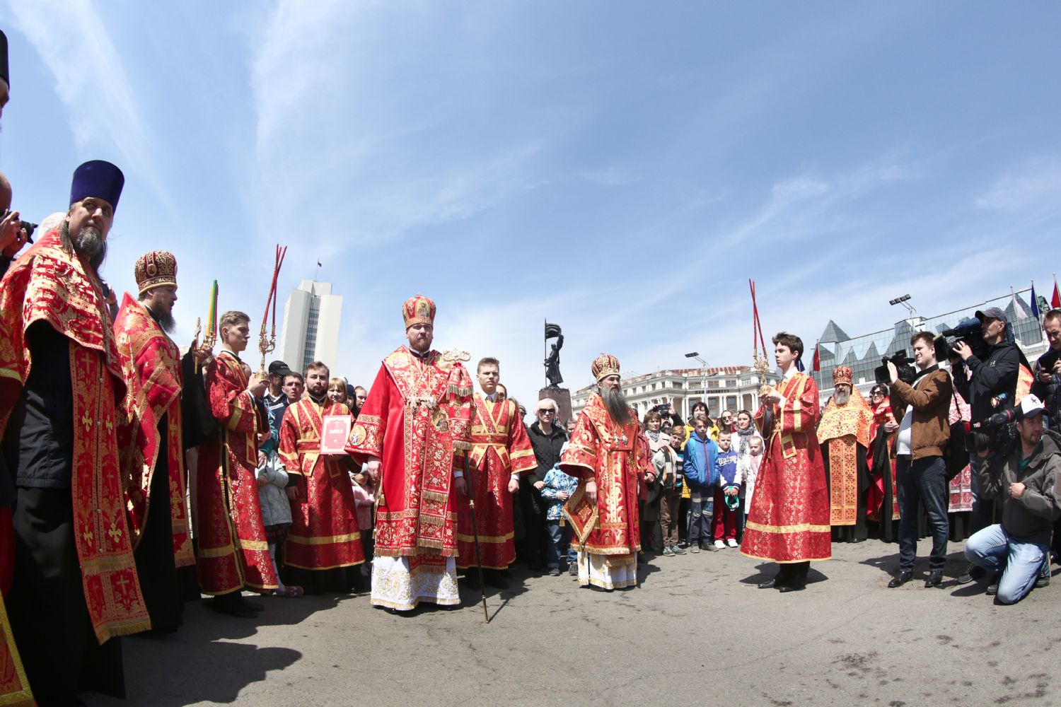 С большой иконой Воскресения Христова, святынями и хоругвями под звуки колокольного звона передвижной звонницы Пасхальный крестный ход проследовал к центральной городской площади, где рядом со строящимся Спасо-Преображенском собором митрополит Владимир совершил праздничный молебен.