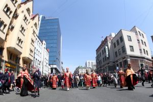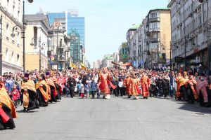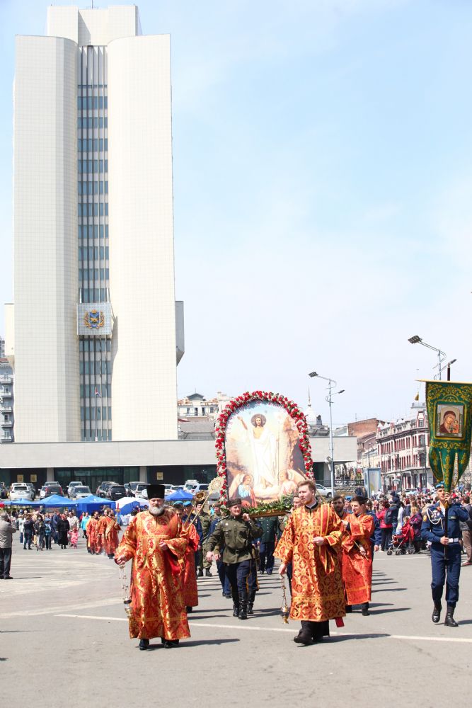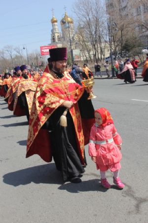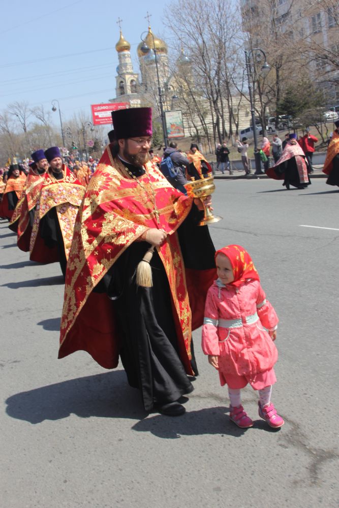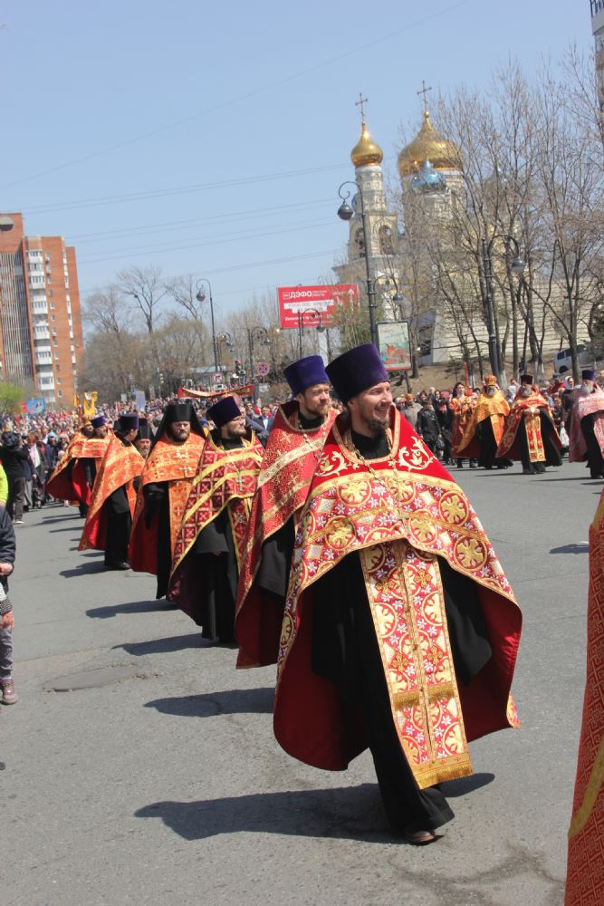 В городскую праздничную колонну вошли руководители епархиальных отделов, настоятели и клир храмов и монастырей, представители приходов, общественных организаций, казачества и учебных заведений Владивостокской епархии: Духовного центра и Православной гимназии — всего порядка 2000 человек. Сбор колонны начинался в Покровском кафедральном соборе, где после пасхальных богослужений прошло также освящение куличей: за благочестивой православной традицией с интересом наблюдали гости Владивостока, туристы из стран АТР.