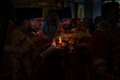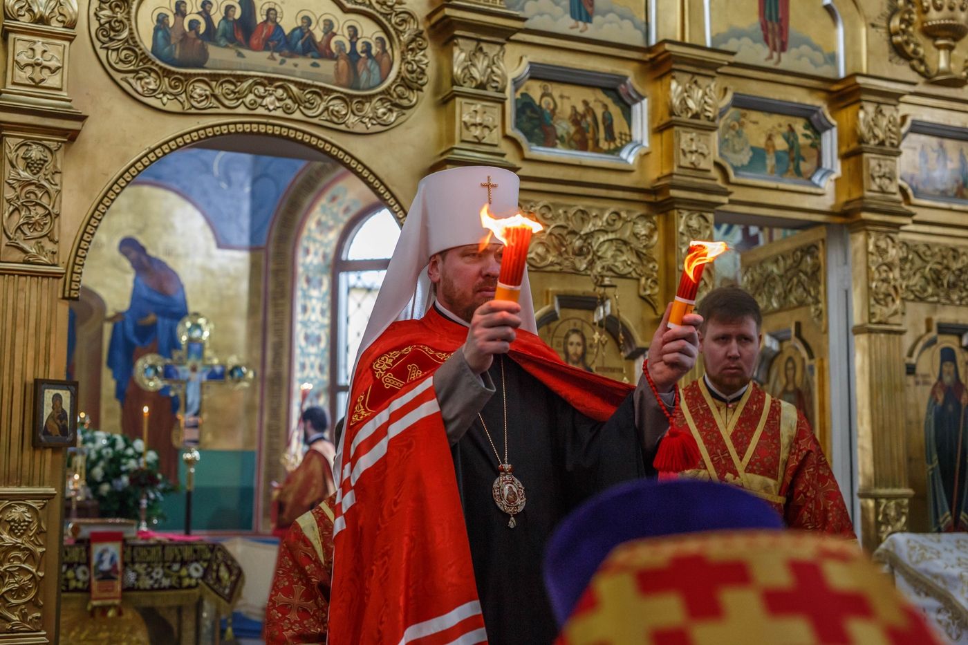 Перед началом богослужения глава Приморской митрополии внес в храм Благодатный огонь, доставленный в понедельник во Владивосток.