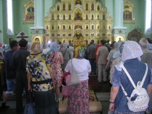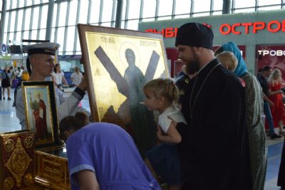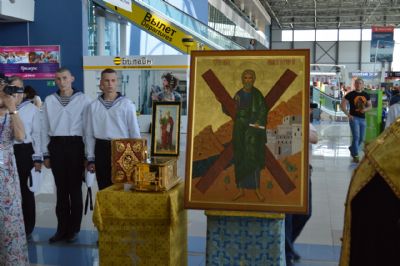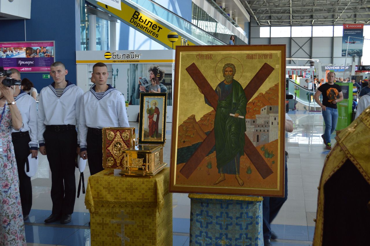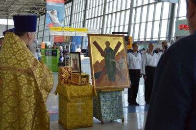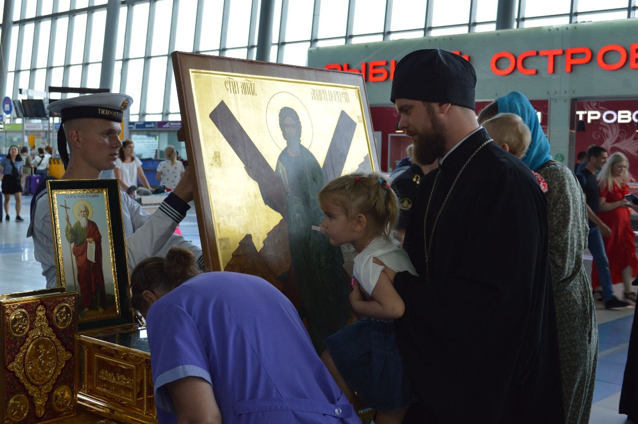 Под пение тропаря святому апостолу Андрею Первозванному в зале прилета аэропорта ковчег принял протоиерей Евгений Маляр, благочинный III округа Владивостокской епархии, после чего духовенством благочиния был совершен молебен, по окончании которого все желающие из числа присутствующих в аэропорту людей смогли приложиться к святым мощам.