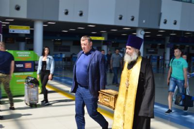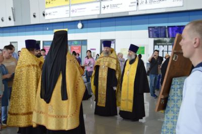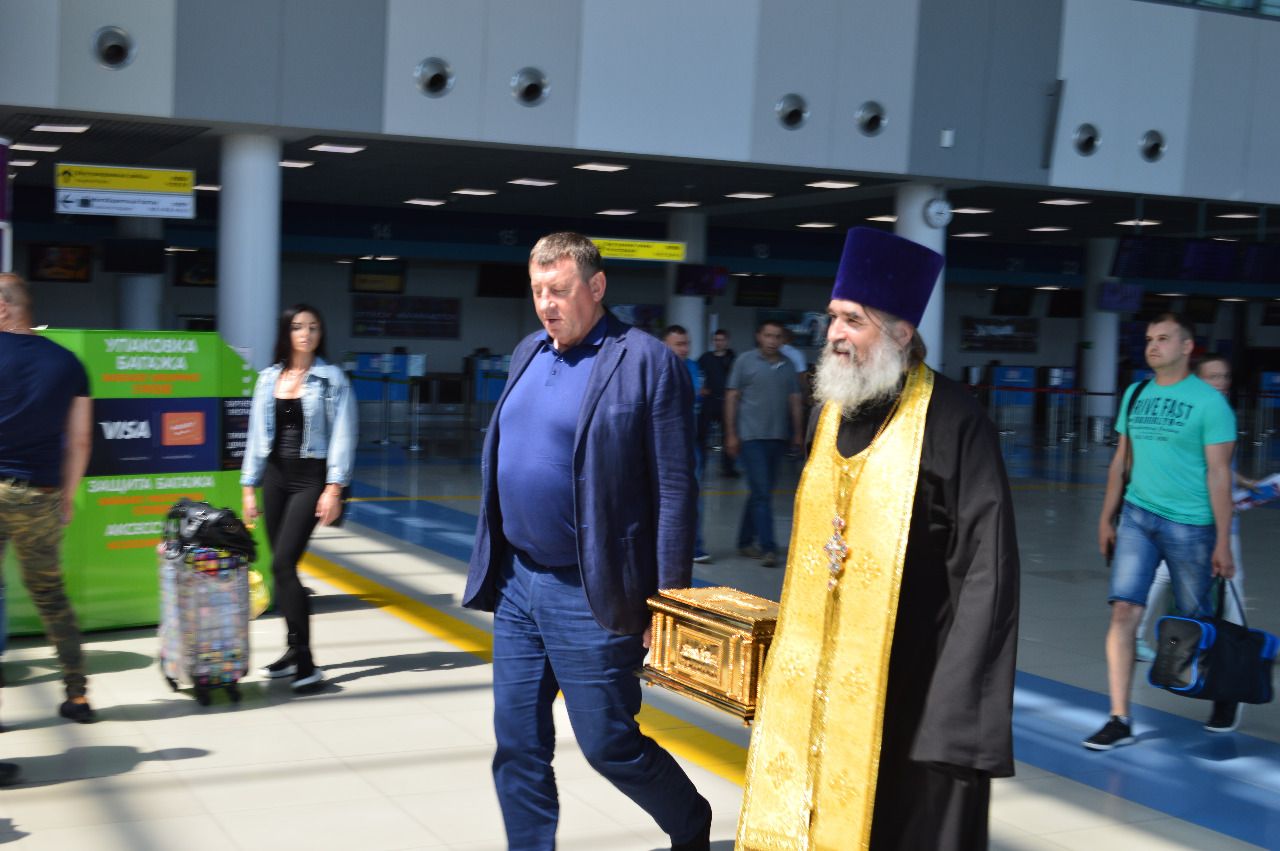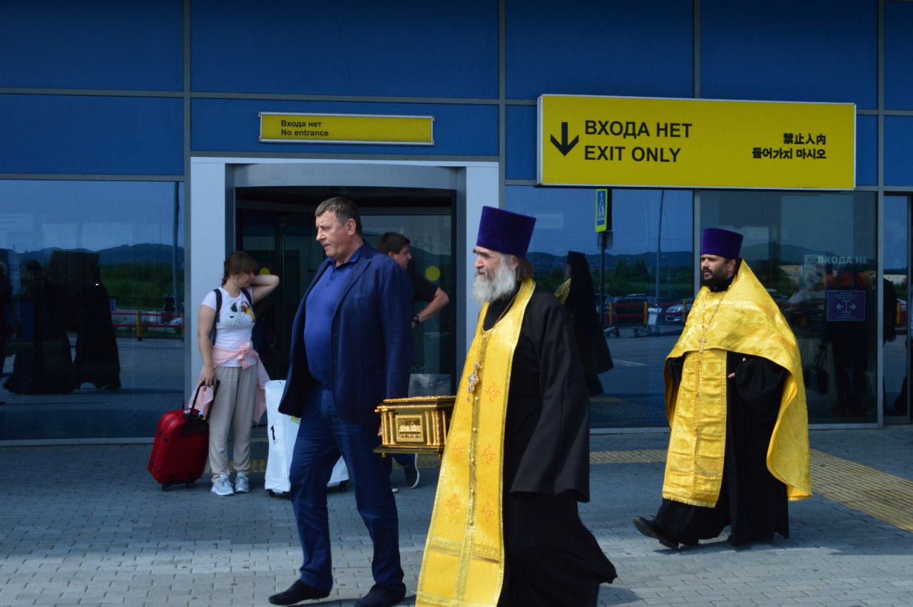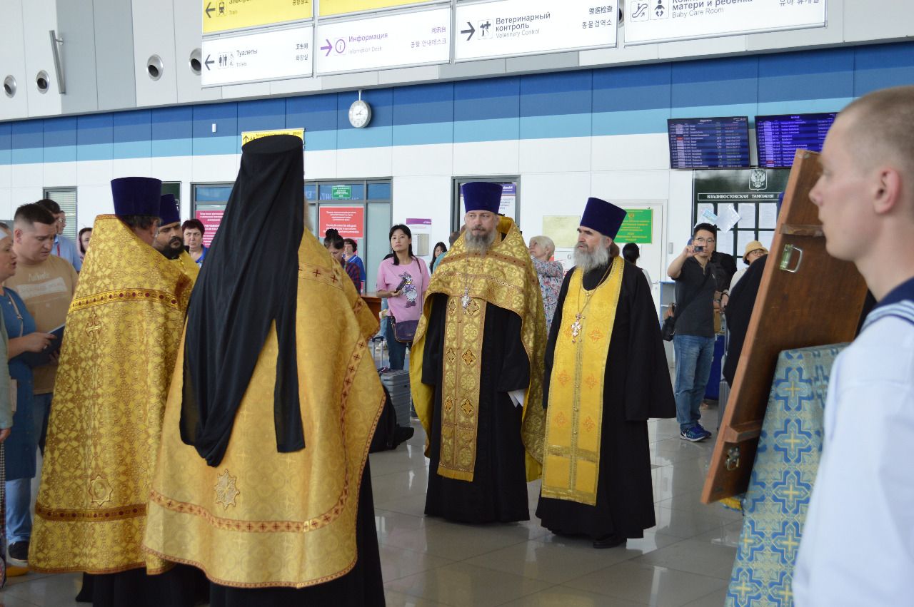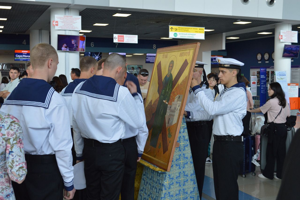 В торжественной встрече святыни в международном аэропорту «Владивосток» приняли участие священнослужители Владивостокской епархии, представители Тихоокеанского флота и почетный караул ТОФ.