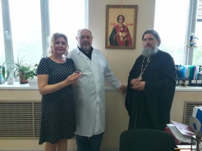 А в приемной главврача ВКБ №2 повесили икону святого великомученика и целителя Пантелеимона, после чего перед ней зажгли лампадку от благодатного огня из Иерусалима, который передал сотрудникам больницы отец Александр.