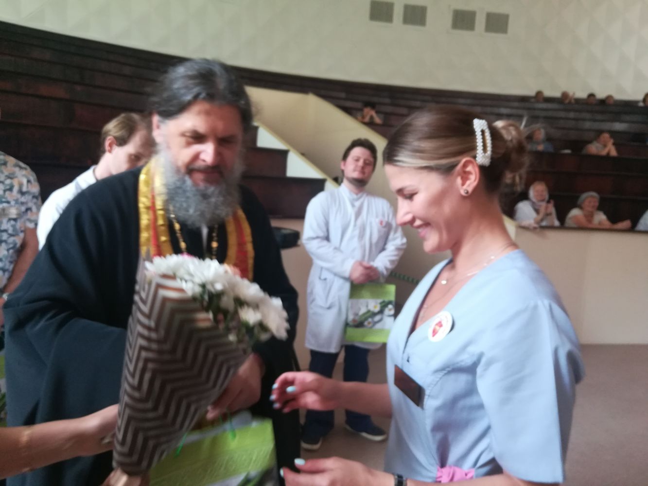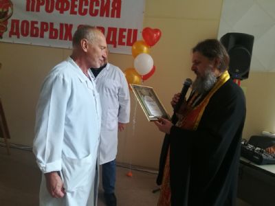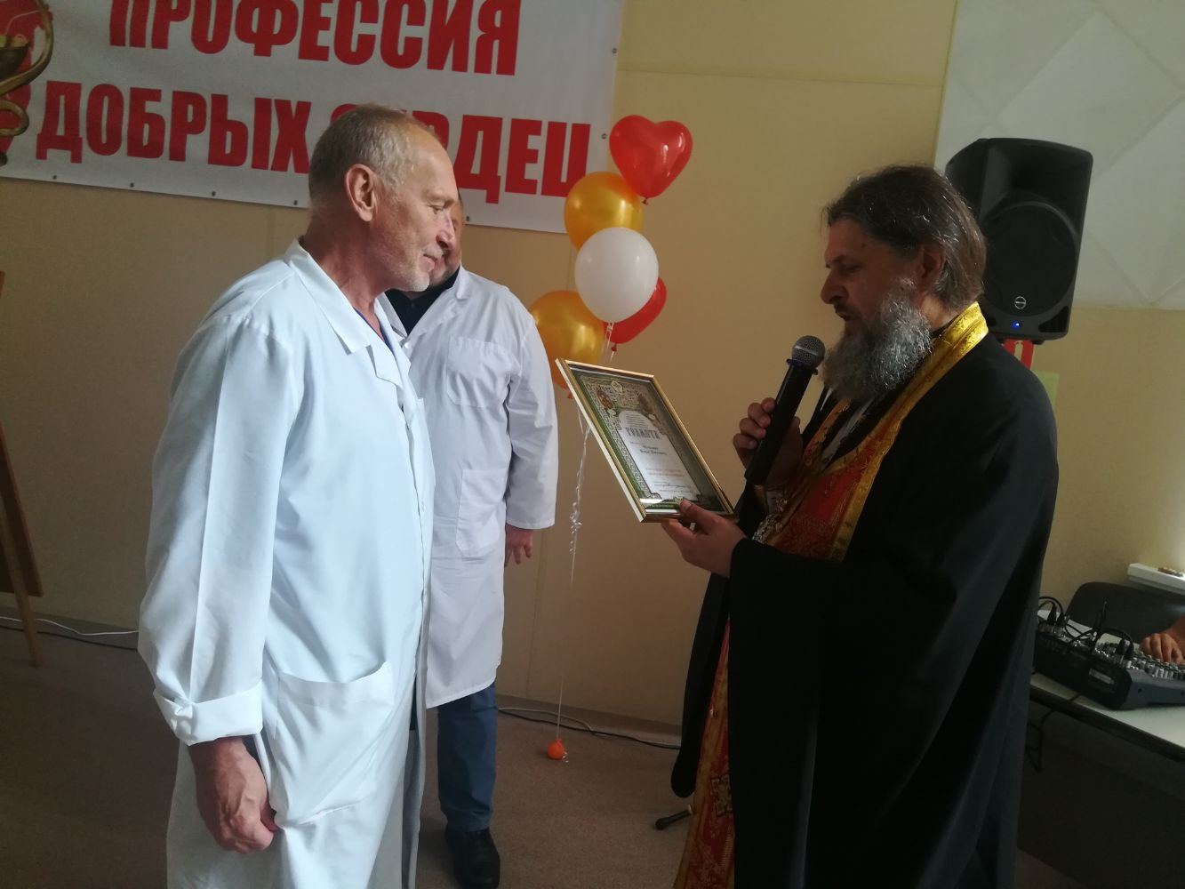 После этого руководитель социального отдела, председатель Общества православных врачей г. Владивостока, настоятель храма в честь святого великомученика и целителя Пантелеимона протоиерей Александр Талько поздравил с праздником заслуженных врачей, которые не один десяток лет трудятся в ВКБ №2. Это главврач Вячеслав Викторович Глушко, заведующий отделением хирургии врач-хирург Олег Николаевич Дмитриев, заведующий кафедрой травматологии и ортопедии ТГМУ врач-травматолог Евгений Петрович Костив, врач-онколог Игорь Павлович Истомин и врач-гинеколог Татьяна Даниловна Новикова.