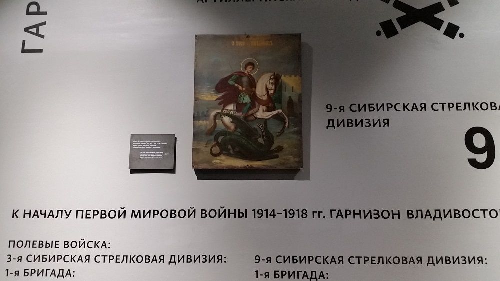 - Самой яркой частью этой экспозиции является многочасовой видеофильм о всех фортах крепости, который показывается на большом экране и рядом находящийся с ним макет города Владивостока с указанием крепостных точек, - рассказывает владыка Иннокентий.- Не каждый из нас сможет увидеть Владивостокскую крепость с высоты птичьего полета - а на выставке это возможно. В одной частей выставки имеются познавательные рассказы о людях, служивших в крепости. В их числе были и священники полковых храмов о. Русский - о них можно найти информацию на стендах (наша епархия помогла найти архивные материалы) . Представлена в экспозиции и икона святого великомученика Георгий Победоносца (их фондов музея имени В. Арсеньева).