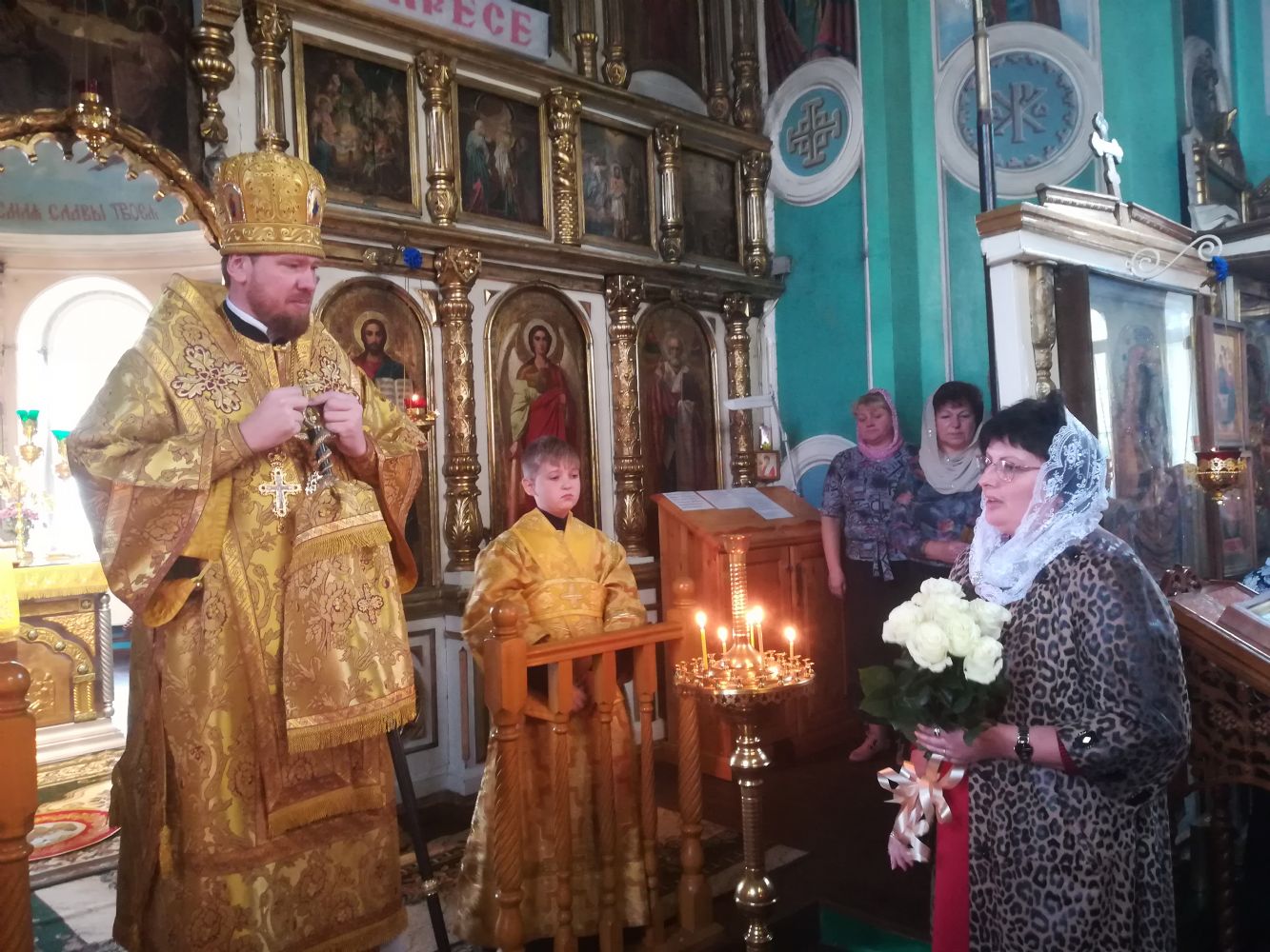 По окончании богослужения глава администрации Скопинского муниципального района Александр Боков и заместитель главы администрации города Скопина Ирина Ланина приветствовали владыку Владимира и преподнесли ему букеты цветов.