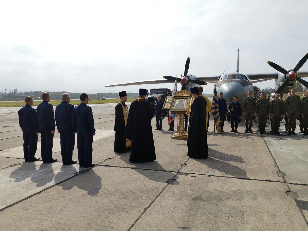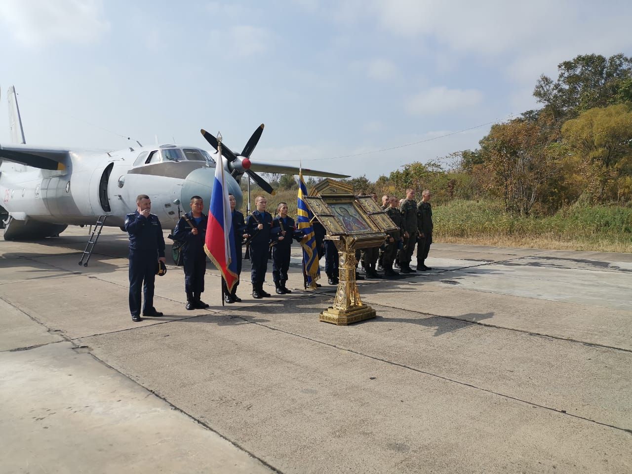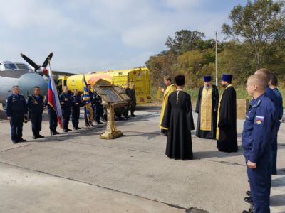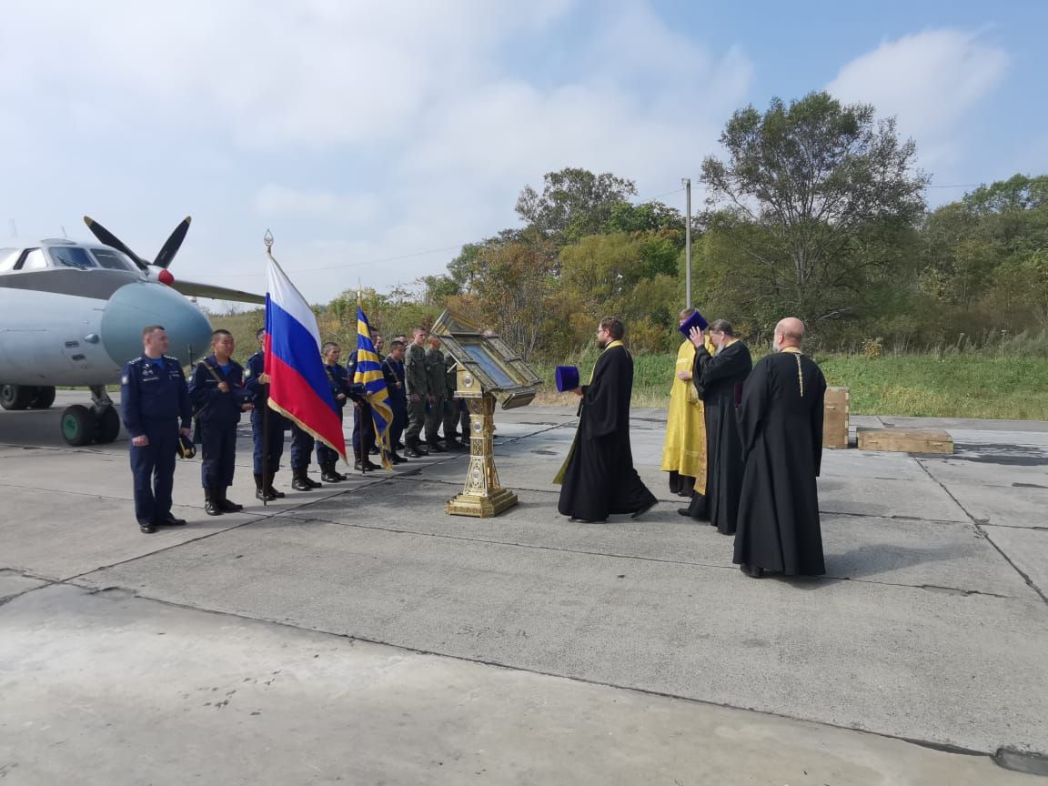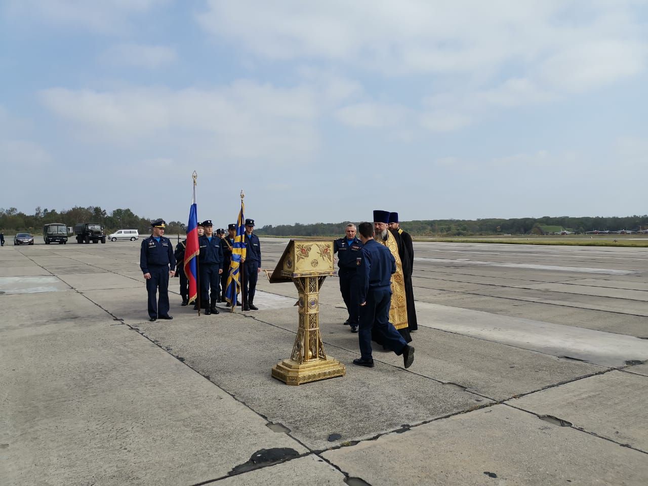 На взлетной полосе аэродрома Димитрий Федорин, благочинный I округа Владивостокской епархии, под пение тропаря пророку Божию Илие встретил икону, прибывшую во Владивостокскую епархию воздушным транспортом по благословению митрополита Владивостокского и Приморского Владимира.