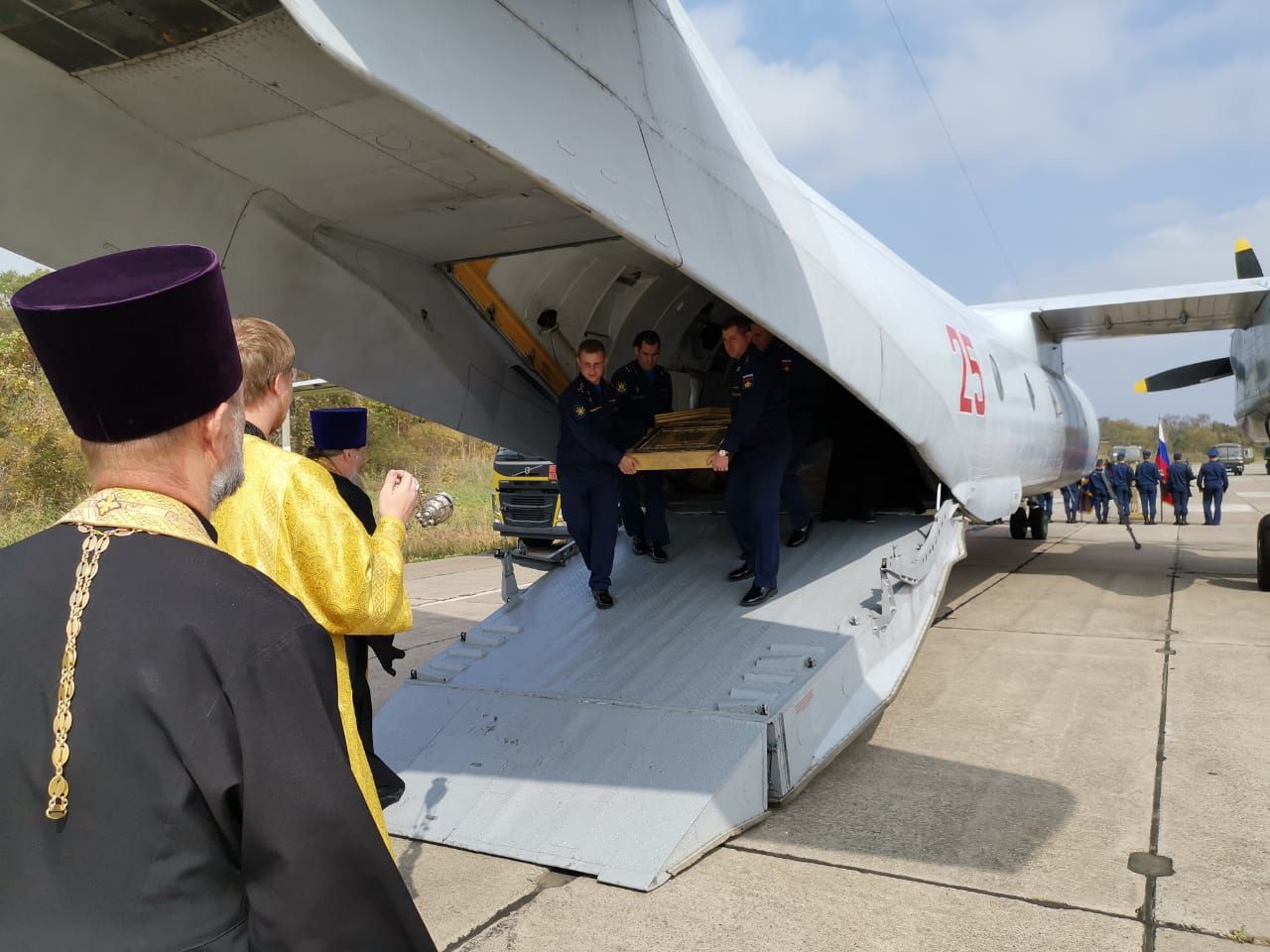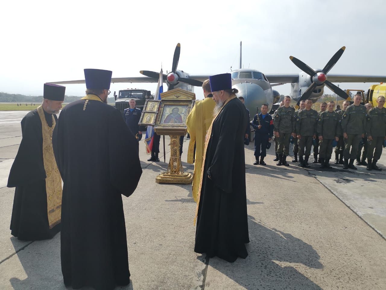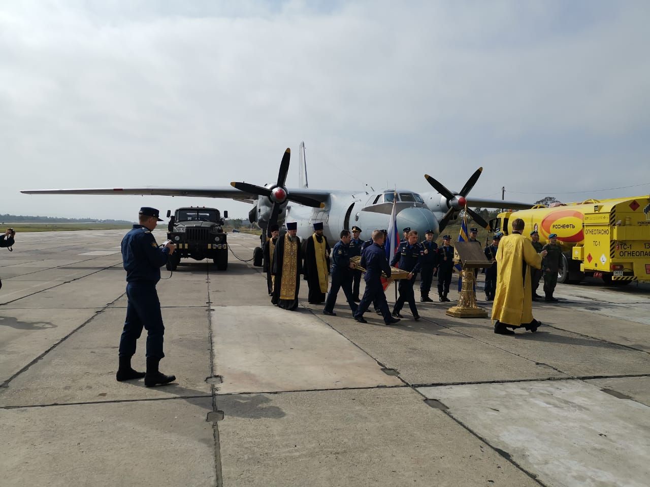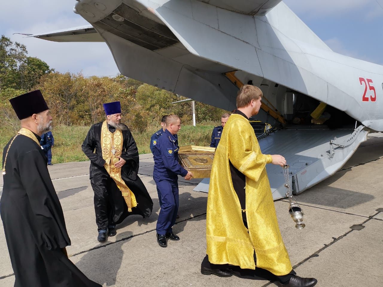 На взлетной полосе аэродрома Димитрий Федорин, благочинный I округа Владивостокской епархии, под пение тропаря пророку Божию Илие встретил икону, прибывшую во Владивостокскую епархию воздушным транспортом по благословению митрополита Владивостокского и Приморского Владимира.