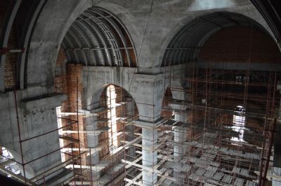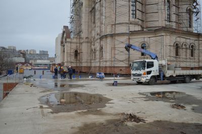 В настоящее время завершаются затирочные работы кирпичной кладки, продолжаются кровельные работы: ведется фальцевание медью фасадных элементов и конструкций.