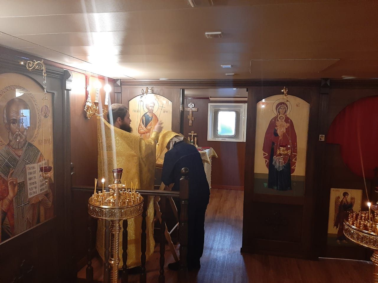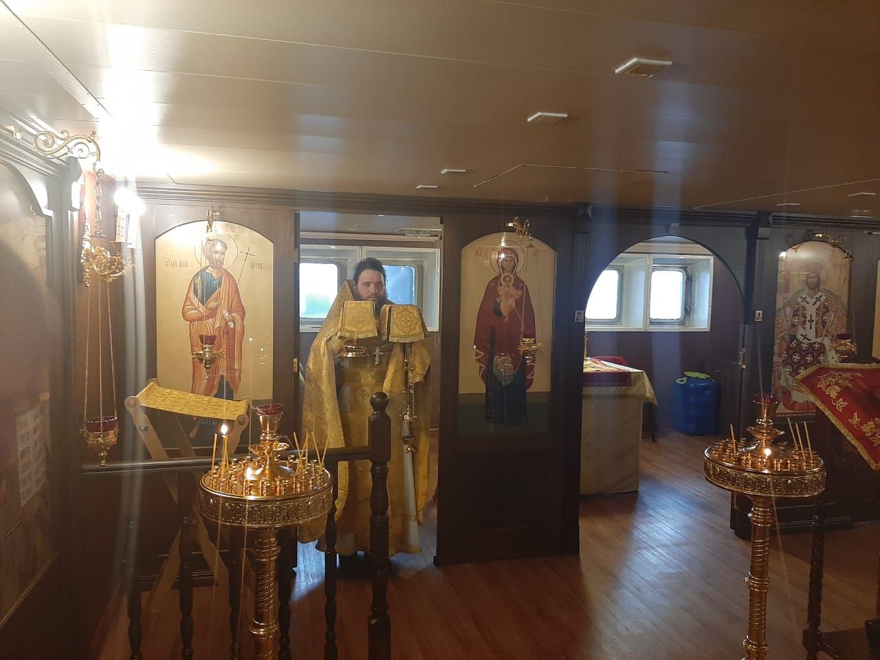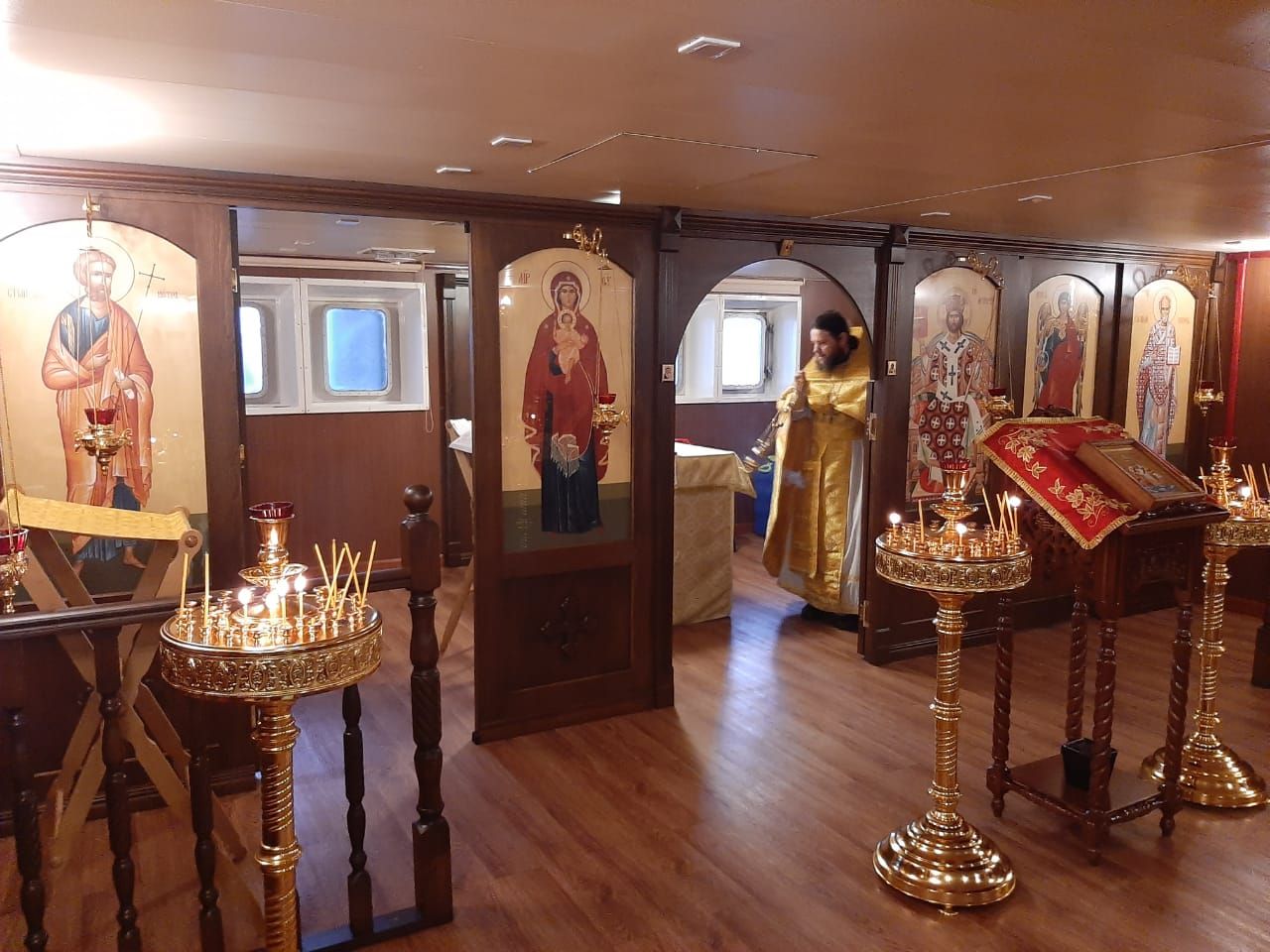 Тихий океан. 19 декабря, в день памяти святителя Николая, архиепископа Мир Ликийских, Чудотворца, иерей Иоанн Караман совершил Божественную литургию в корабельном храме в честь Николая Чудотворца на плавбазе «Всеволод Сибирцев», находящейся посреди океана.