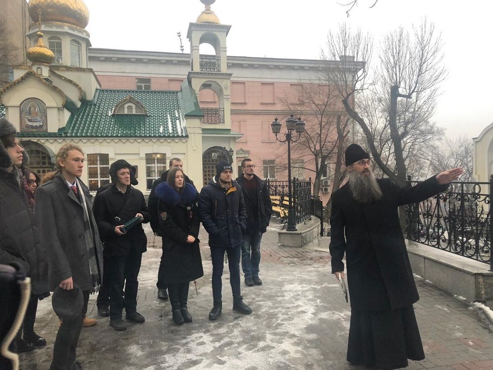 Первой остановкой в программе стал Успенский храм, где его настоятель - епископ Уссурийский Иннокентий, доцент кафедры теологии, провел экскурсию по церковной территории, храму и вспомогательным помещениям прихода. Студенты узнали не только об истории Успенского собора, его святынях и первых православных жителях Владивостока, но и познакомились с современностью прихода: социальной, молодежной, образовательной деятельностью. В конце встречи владыка пригласил студентов на чаепитие в приходскую трапезную, где общение продолжилось в формате вопрос-ответ. Между прочим, владыка, как преподаватель курса «Практическая теология», предложил своим студентам, после поездки написать эссе.