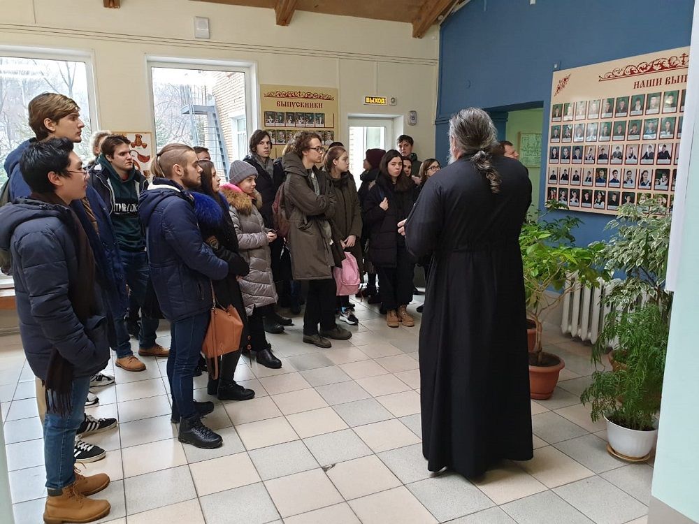 На следующем этапе программы маршрут поездки остановился в Православной гимназии. Здесь студенческая молодежь впервые посетила Кирилло-Мефодиевский храм, о котором рассказ вел сам настоятель – протоиерей Игорь Талько. Затем ребята прикоснулись к истории создания и деятельности гимназии, узнали много для себя нового о том, чем отличается обычная школа от православной. В конце всего они смогли воочию пообщаться со старшеклассниками и посмотреть презентацию. Напоследок гимназия угостила студентов вкусными булочками, выпеченными в собственной трапезной.