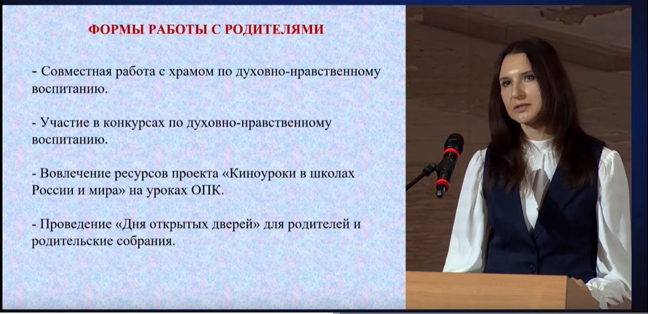 Особая задача спасчан заключалась в представлении системы духовного воспитания школьников. Косолапова Татьяна Леонидовна рассказала о сетевых проектах, творческих конкурсах и образовательных мероприятиях, проводимых совместно с храмом Вознесения Господня с. Спасское. Александрова Елена Петровна представила успешные формы взаимодействия с родителями учащихся, подчеркнув, что число семей, вовлеченных в духовно-нравственные инициативы, ежегодно растет. Чуднова Серафима Михайловна показала, как воскресная школа участвует в образовательном процессе, заинтересовав коллег конкретными примерами взаимодействия педагогов с храмом.