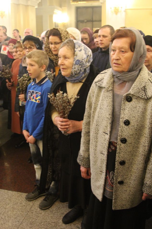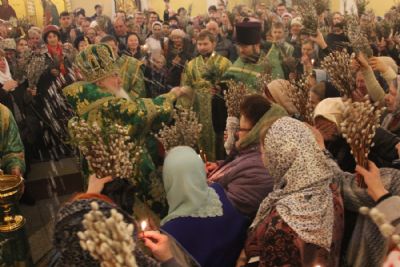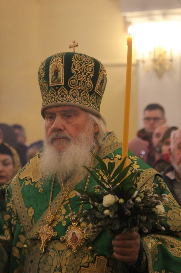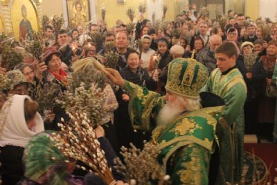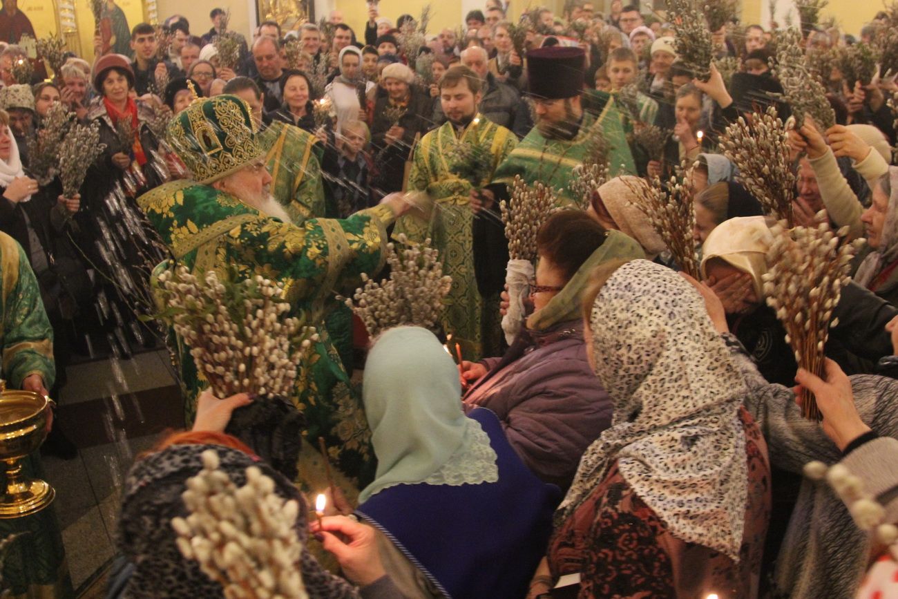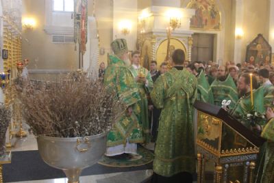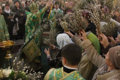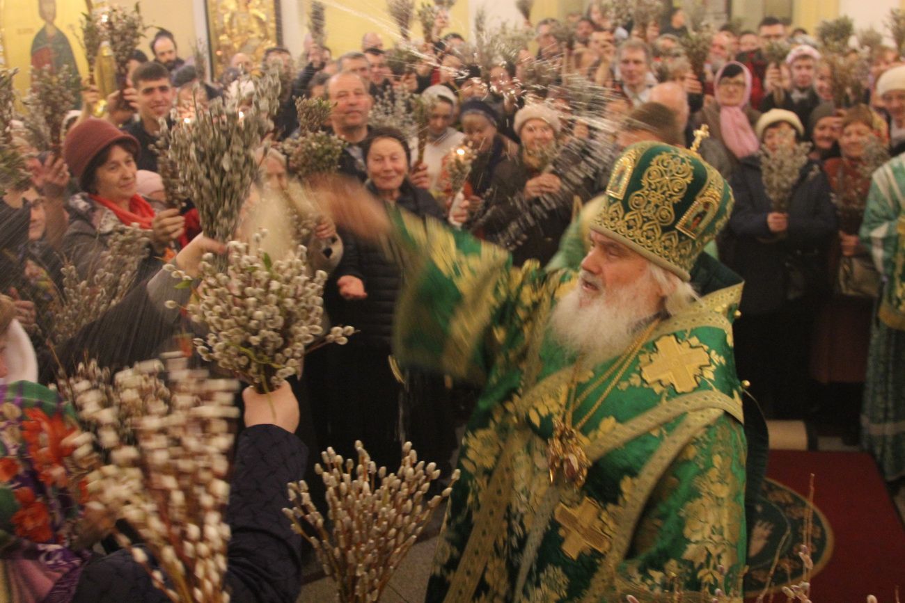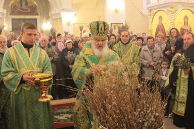 После чтения Евангелия владыка совершил традиционное освящение вербных и пальмовых ветвей (ваий). По окончании богослужения Его Высокопреосвященство поздравил верующих с праздником и окропил вербы святой водой.