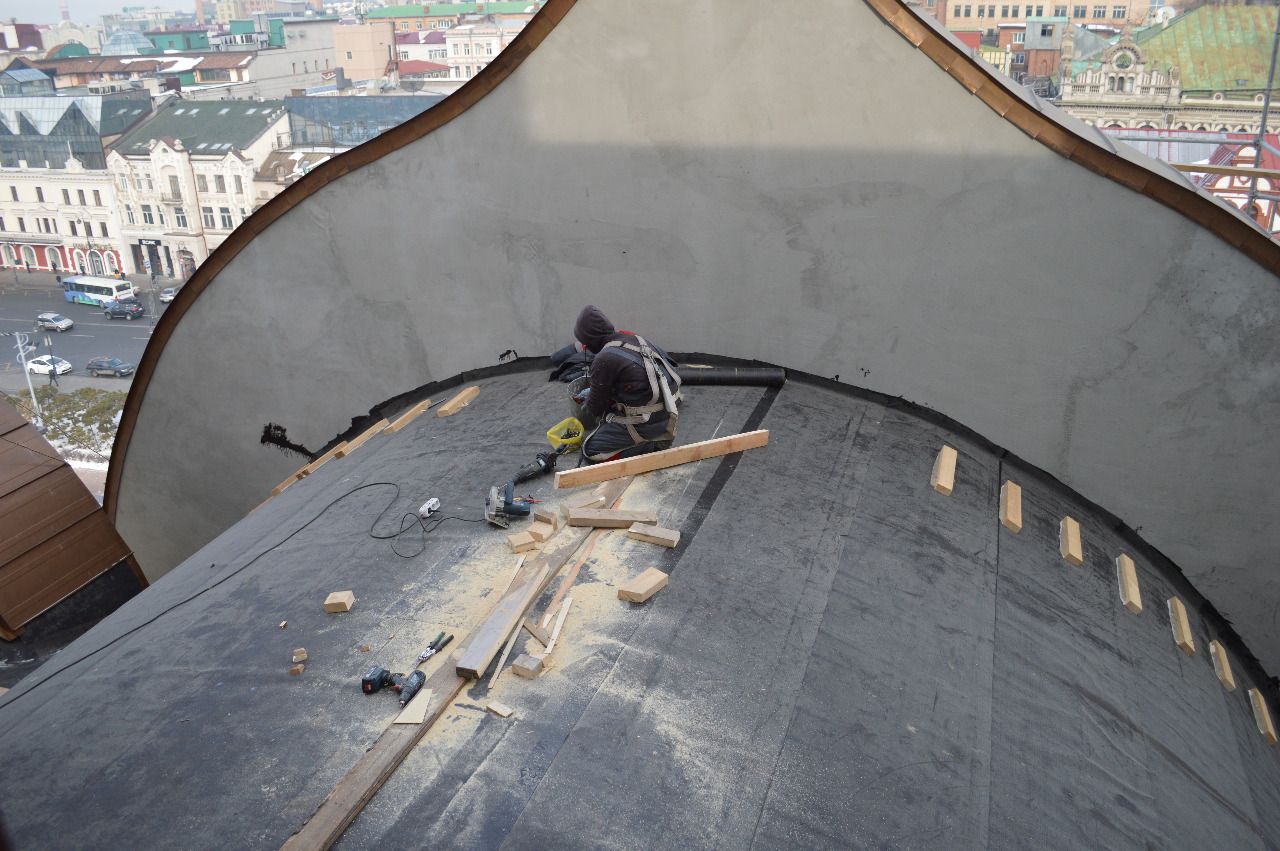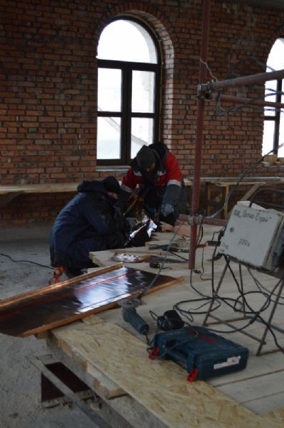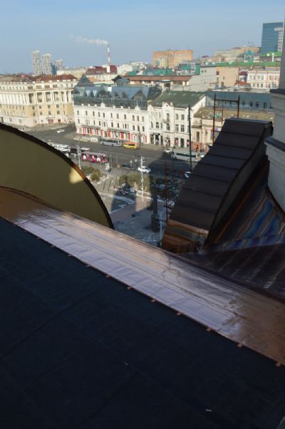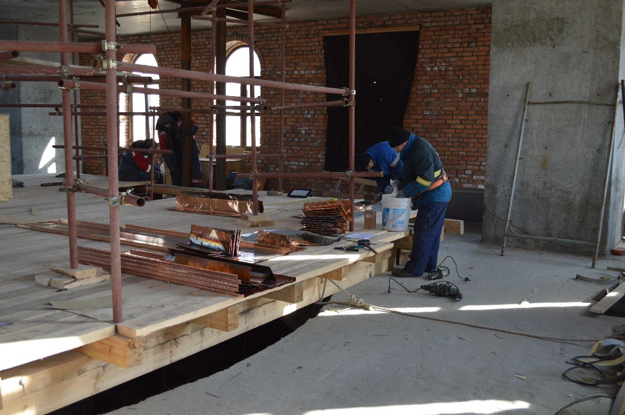 Представитель ООО «Атр-Строй» доложил о ходе кровельных работ, идущих в соответствии с графиком: за январь было устроено более ста квадратных метров фальцевой кровли, завершены работы по устройству кровли типа 12, начаты работы по демонтажу лесов для произведения работ с типом 10.