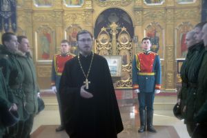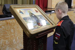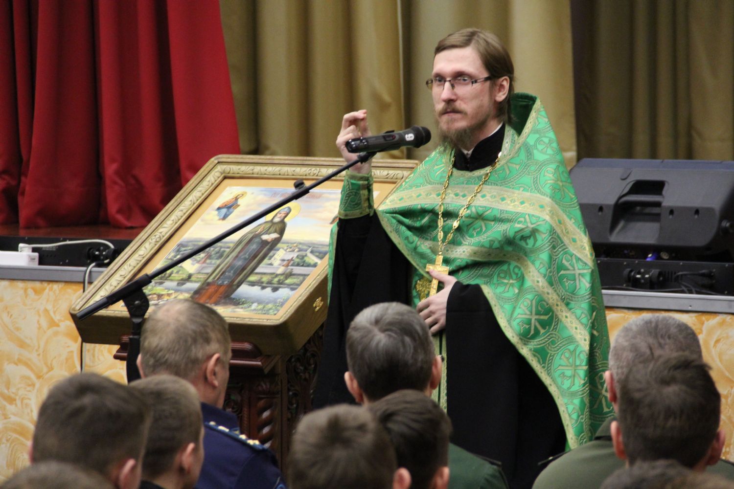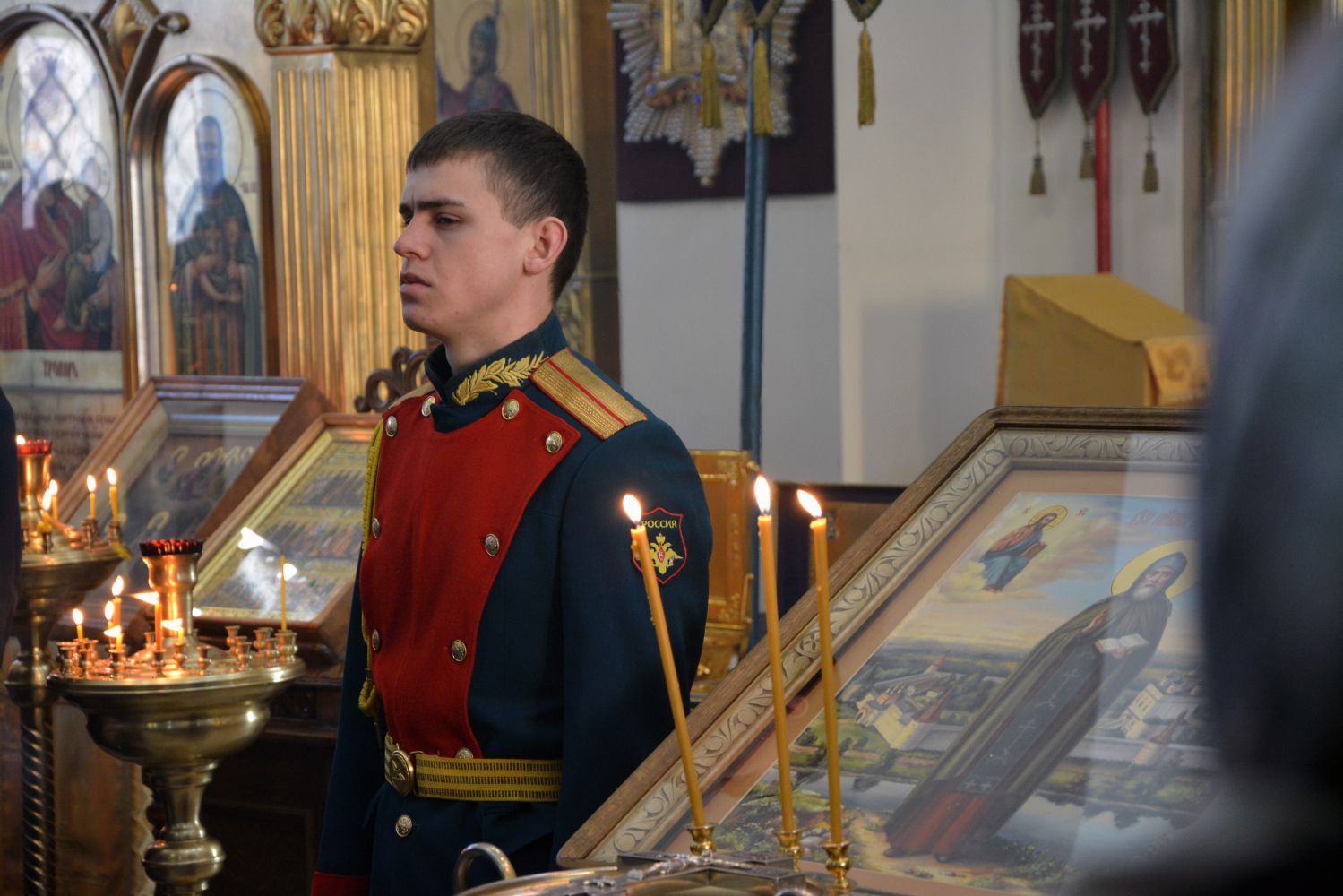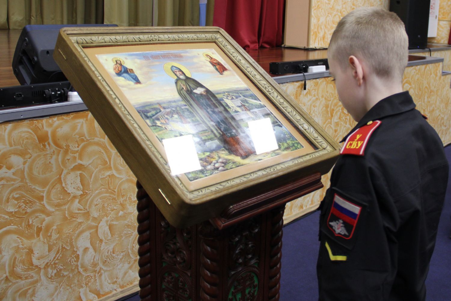 Вечером того же дня святой образ перенесли в Уссурийское Суворовское училище, где ответственный за строительство храма священник II благочиния иерей Павел Моисеев совершил молебен перед святыней в клубе УСВУ. Перед молитвой священник рассказал о благочестивой традиции усваивать видам вооруженных сил и родам войск небесных покровителей и ознакомил присутствующих с жизнеописанием святого Иосифа. На мероприятии присутствовали командование и все воспитанники училища, а также представители МО РФ, которые и сопровождали икону в Приморский край. Затем икона прп. Иосифа Волоцкого вернулась в Покровский храм.
