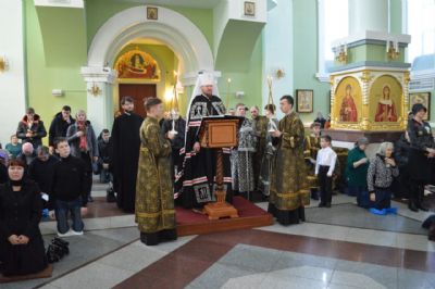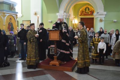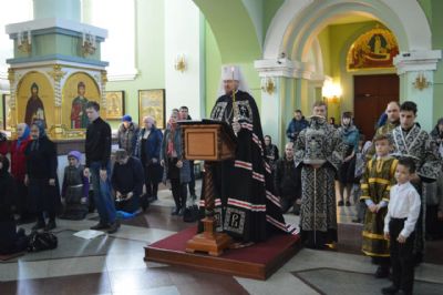 В завершение богослужения владыка Владимир обратился к молящимся с архипастырским словом: «Канон святого Андрея Критского очень для нас важен, потому что на примере образов из Священной истории всего человеческого рода показана трагедия человеческой души. Преподобный так искусно переплетает события библейские с тем, что происходит в каждой человеческой душе, когда она согрешает, отпадая от Бога. Когда она изменяет своему высокому предназначению, когда человек в результате греха падает с высокой свечницы, на которую его поставил Создатель. Изменяет своему высокому призванию, удаляясь от Бога, и потом, как блудный сын, вынужден, образно говоря, питаться со свиньями из корыта для этих животных. Питаться тем, что не должно служить пищей для человека. Множество других примеров преподобный Андрей приводит, для того, чтобы мы поняли, что это отпадение рода человеческого в целом от Бога, может быть соотнесено с теми процессами в духовной жизни, когда человек грешит против правды Божией, нарушает Его заповеди. Ведь время поста являетя временем покаяния. Временем осознания своей греховности. Не случайно в молитве преподобного Ефрема Сирина, которая раз за разом повторяется во время утренних богослужений, во время вечерних Великопостных служб, будет она читаться и во время литургий Преждеосвященных Даров, преподобный просит: «Даруй мне зрети моя прегрешения». Все наши аскетические, небольшие, может быть, труды и воздержания, поклоны и молитва за церковными богослужениями призваны выявить грех в нашей душе. Показать нечистоту. Призваны к тому, чтобы увидеть, как же далеко мы отошли от Бога, что нам необходимо сделать, чтобы вернуться в распростертые объятия отеческой любви нашего Небесного Бога Творца и Создателя, поэтому Святая Церковь и предлагает нашему вниманию глубокий покаянный канон преподобного Андрея Критского», — сказал митрополит Владимир.