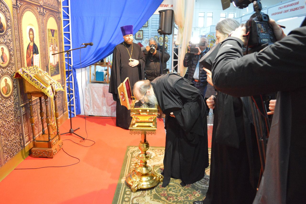 На выставку из Никольского собора Владивостока для поклонения верующих принесен ковчег с частицей мощей великомученика Георгия Победоносца. Святой почитается христианами уже почти два тысячелетия как покровитель всех, подвергающихся нападениям, и помощник в каждом добром начинании. Молятся ему о помощи в принятии важных решений, избавлении от опасности, успехе в делах.
