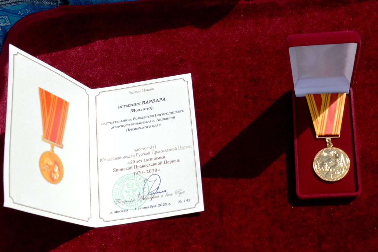 Затем митрополит Владимир совершил награждение настоятельницы Богородице-Рождественского женского монастыря игуменьи Варвары (Волгиной) юбилейной медалью Русской Православной Церкви «50 лет автономии Японской Православной Церкви 1970–2020», напомнив, что две сестры воспитанные ею в обители, многие годы достойно несут послушание в Японской Автономной Церкви.