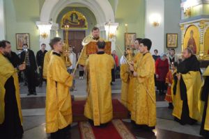 Его Высокопреосвященству сослужили: ключарь собора иеромонах Иоанн (Костин), игумен Антоний (Каменчук), игумен Тихон (Иршенко), протоиерей Игорь Шевчук, иерей Максим Точуков, иерей Владимир Плотников.