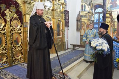 В завершение богослужения настоятель храма Покрова Пресвятой Богородицы протоиерей Сергий Якутов от имени клира и прихожан поблагодарил владыку за совместную молитву и преподнес ему букет цветов.