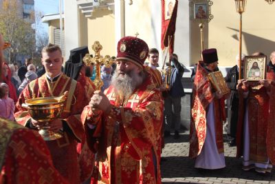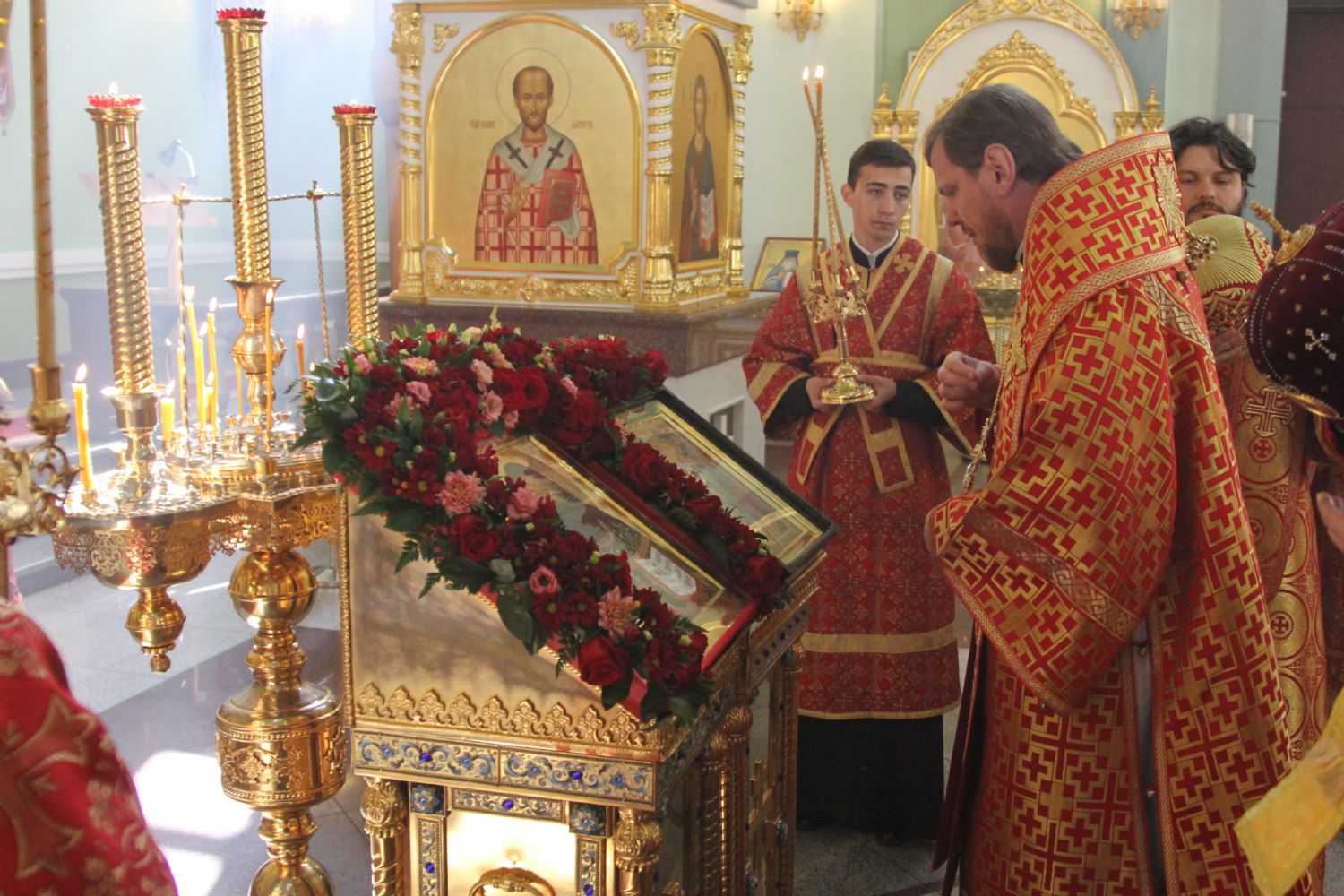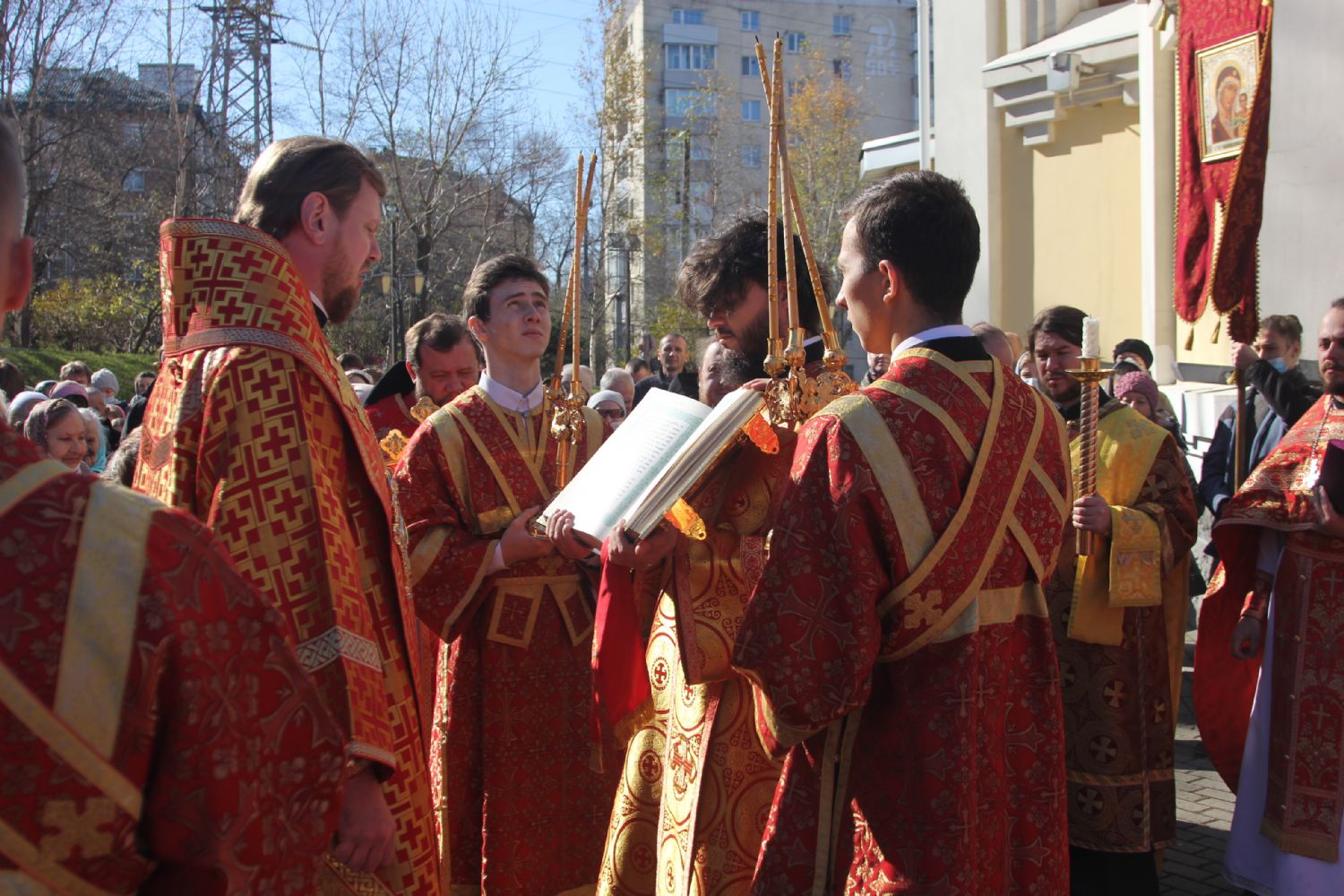 По заамвонной молитве глава Приморской митрополии возглавил крестный ход вокруг храма, по завершении которого было совершено славление священномученику Павлу.