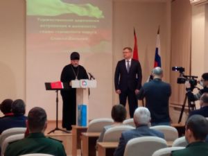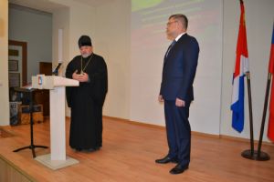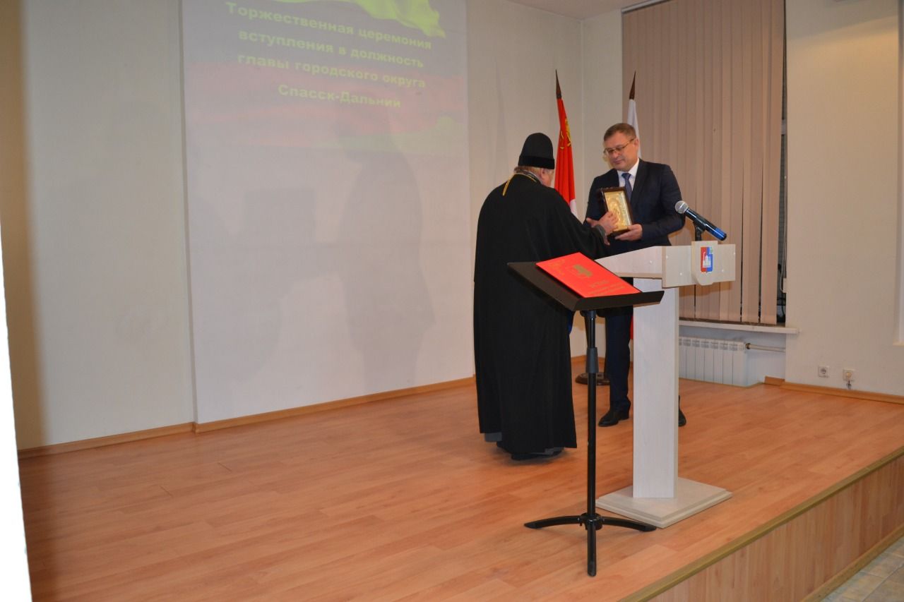 Спасское. Благочинный VI округа Владивостокской епархии, настоятель храма Вознесения Господня село Спасское протоиерей Владимир Капитанюк принял участие в торжественной церемонии вступления Андрея Бессонова в должность главы городского округа Спасск-Дальний.
