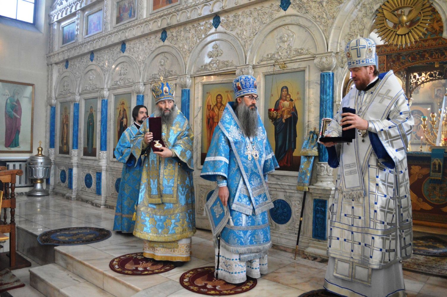 Затем митрополит Владимир поздравил епископа Гурия с недавно отмечавшимся шестидесятилетием, а епископа Иннокентия — с приближающимся десятилетием архиерейской хиротонии, и вручил архипастырям памятные подарки — святые панагии.