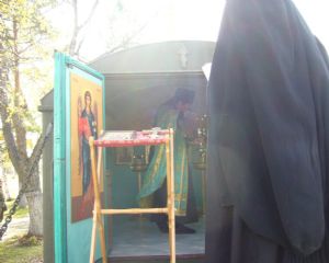 По окончании чина освящения мобильный часовни игумен Пимен обратился к присутствующим с пастырским словом и окропил молящихся святой водой.