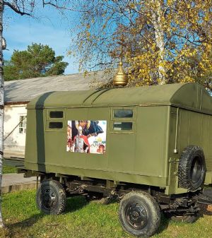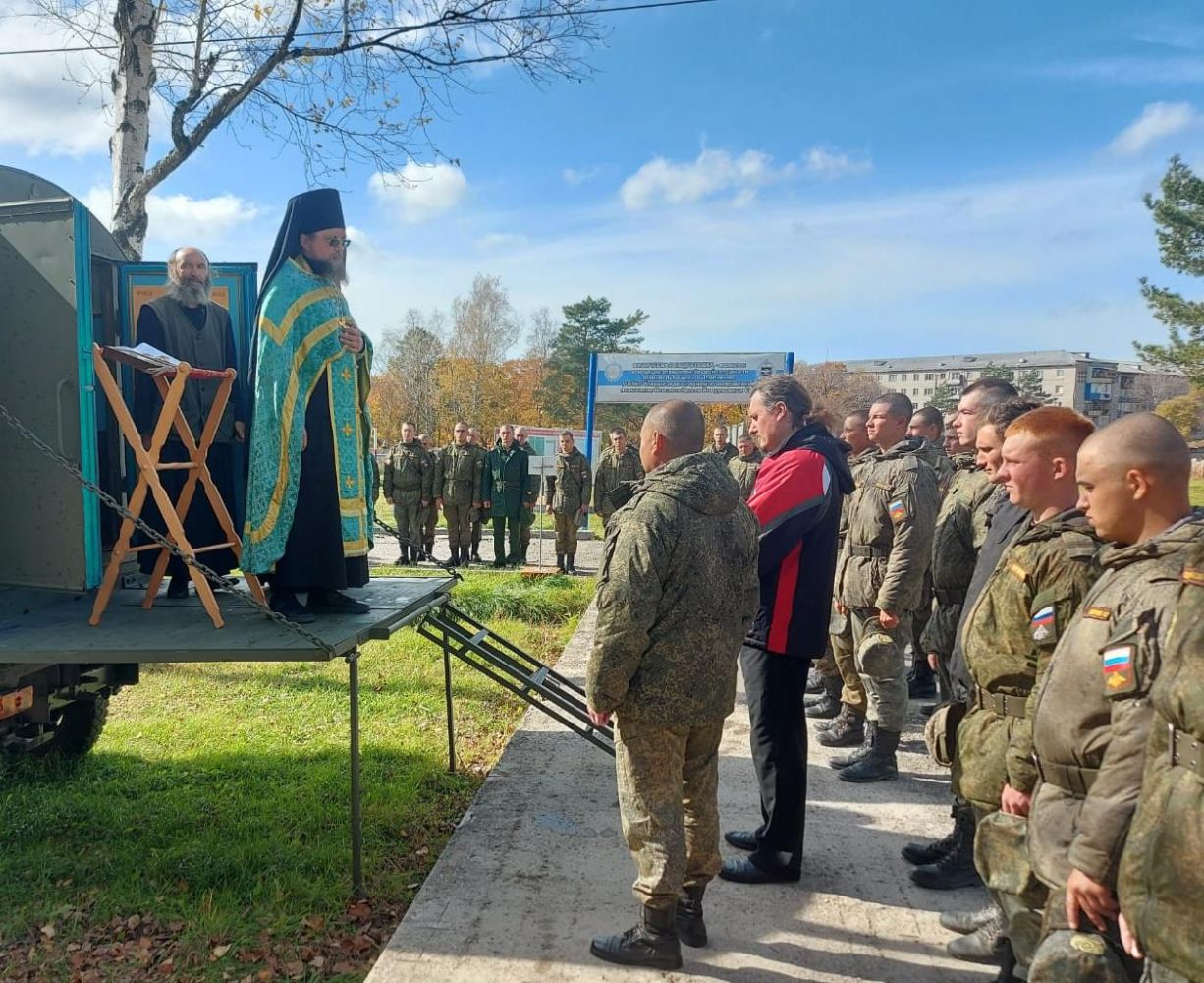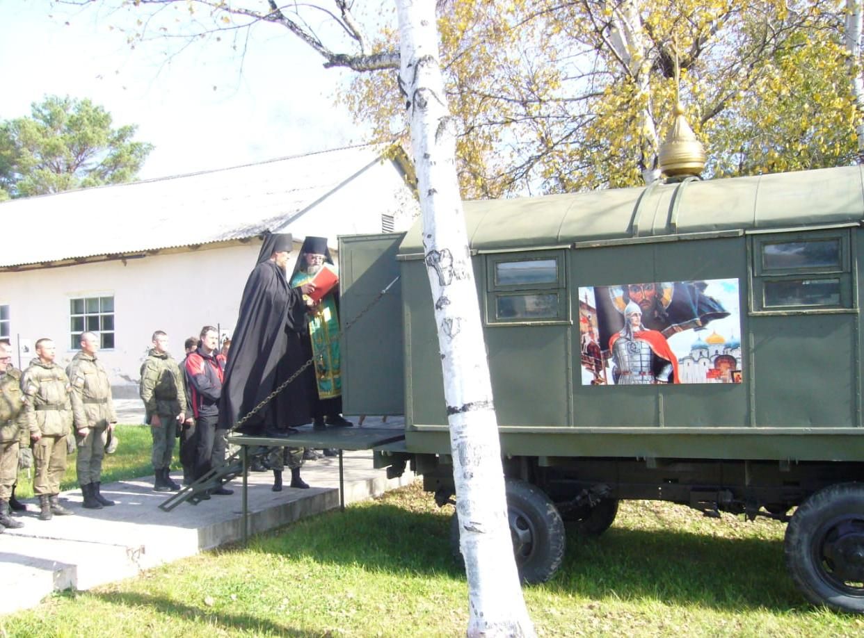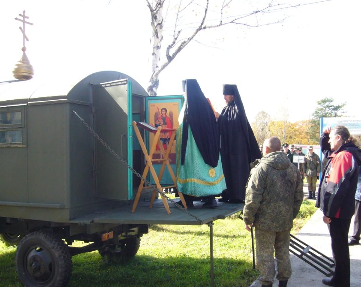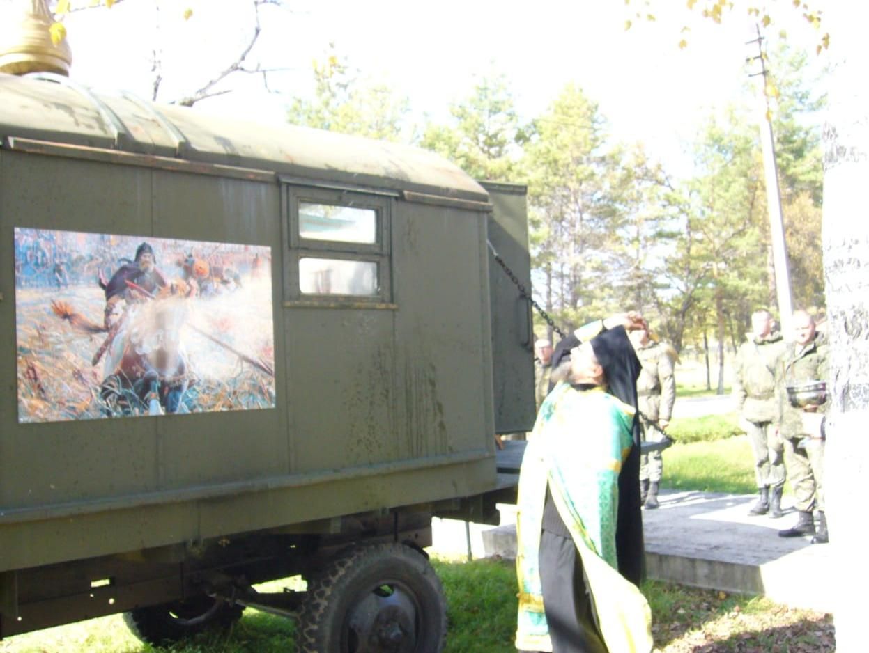 Лесозаводск. 13 октября 2022 года наместник Свято-Троицкого Николаевского монастыря п. Горные Ключи игумен Пимен (Литовкин) совершил освящение мобильной часовни в войсковой части 58079.