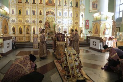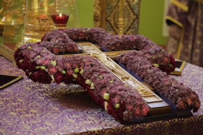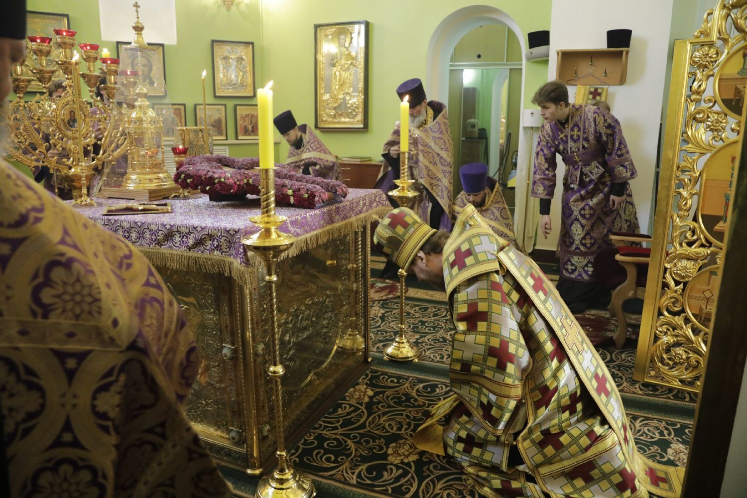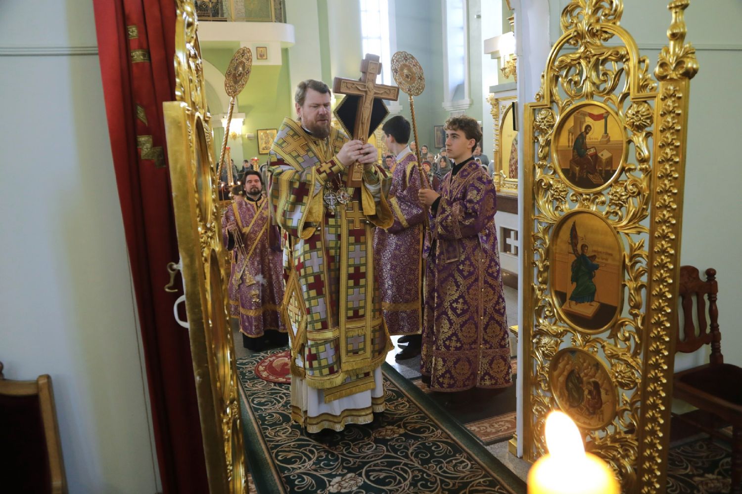 После Великого славословия митрополит Владимир совершил чин выноса Честного и Животворящего Креста Господня для поклонения.