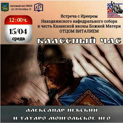 15 апреля 2026 года иерей Виталий Шаркеев посетил Находкинский колледж искусств и встретился с учащимися. Темой беседы стало осмысление исторической роли князя Александра Невского в контексте сложных взаимоотношений Руси с Золотой Ордой в XIII веке.