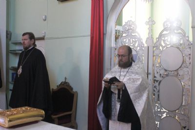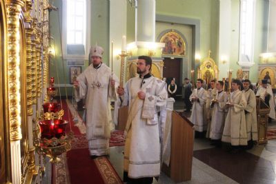 Его Высокопреосвященству сослужили: ключарь собора иеромонах Иоанн (Костин), игумен Антоний (Каменчук), протоиерей Игорь Шевчук, иерей Максим Точуков.