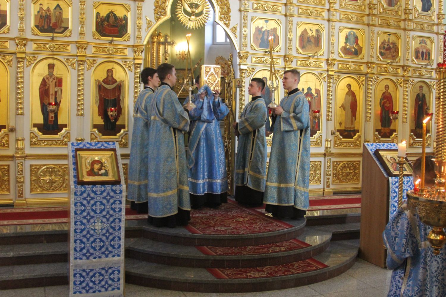 Его Высокопреосвященству сослужили: исполняющий обязанности ключаря Покровского собора иерей Владимир Плотников, игумен Антоний (Каменчук), протоиерей Игорь Шевчук, иерей Максим Точуков, иерей Дионисий Ищенко.