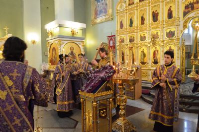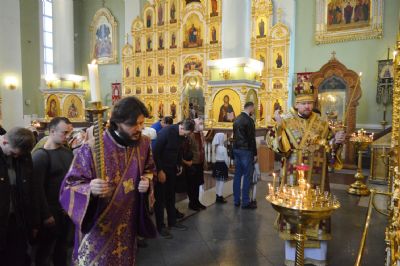 Его Высокопреосвященству сослужили: исполняющий обязанности ключаря Покровского собора иерей Владимир Плотников, игумен Антоний (Каменчук), протоиерей Игорь Шевчук, иерей Максим Точуков, иерей Дионисий Ищенко.