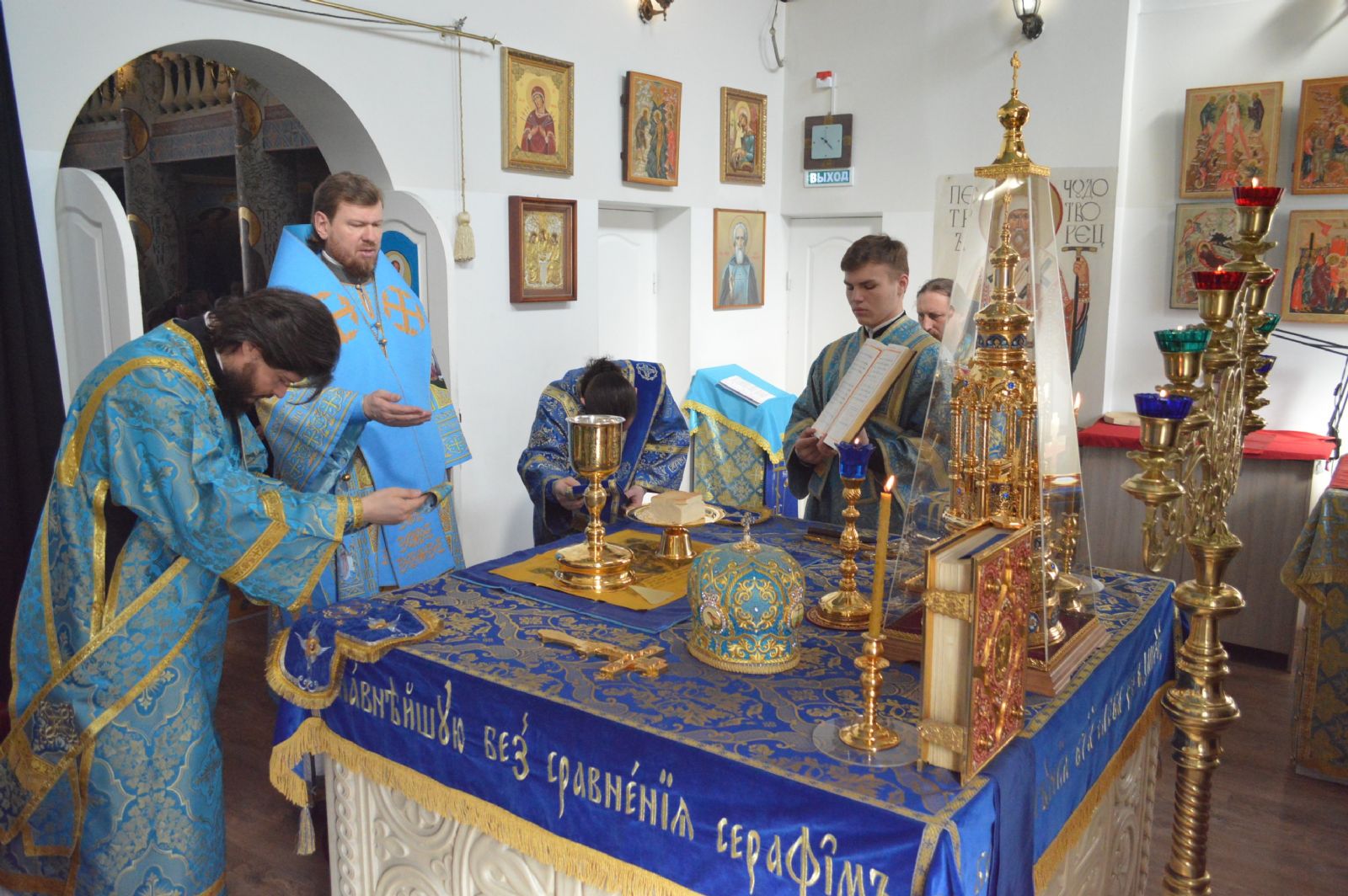 По отпусте литургии было совершено славление Пресвятой Владычице нашей Богородице и Приснодеве Марии в честь праздника Ея Благовещения.