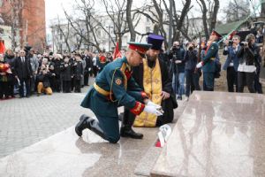 В основание монумента при участии руководителя епархиального отдела по связям с Вооруженными силами РФ иерея Даниила Есакова была заложена заложена капсула с освященной землей, которую привезли с острова Даманский. Епископ Уссурийский Иннокентий совершил освящение памятного места и монумента, а затем обратился к присутствующим с приветственным словом.