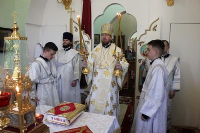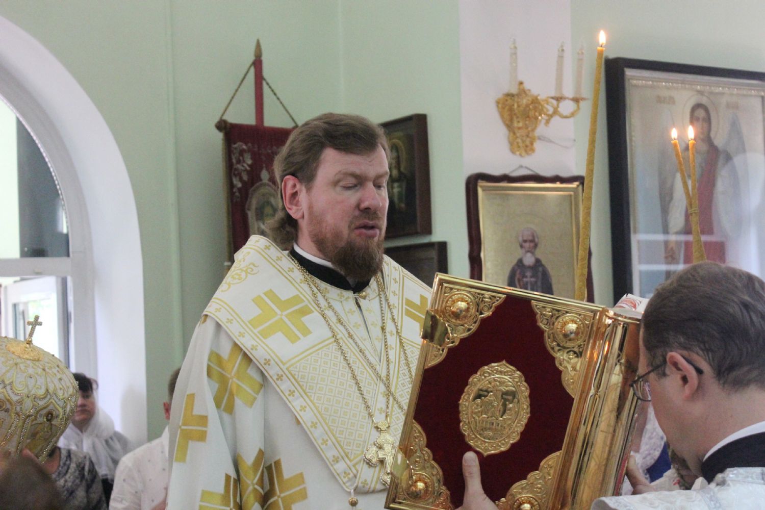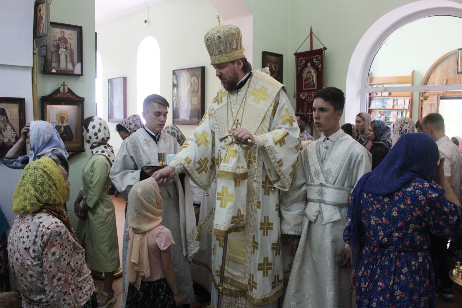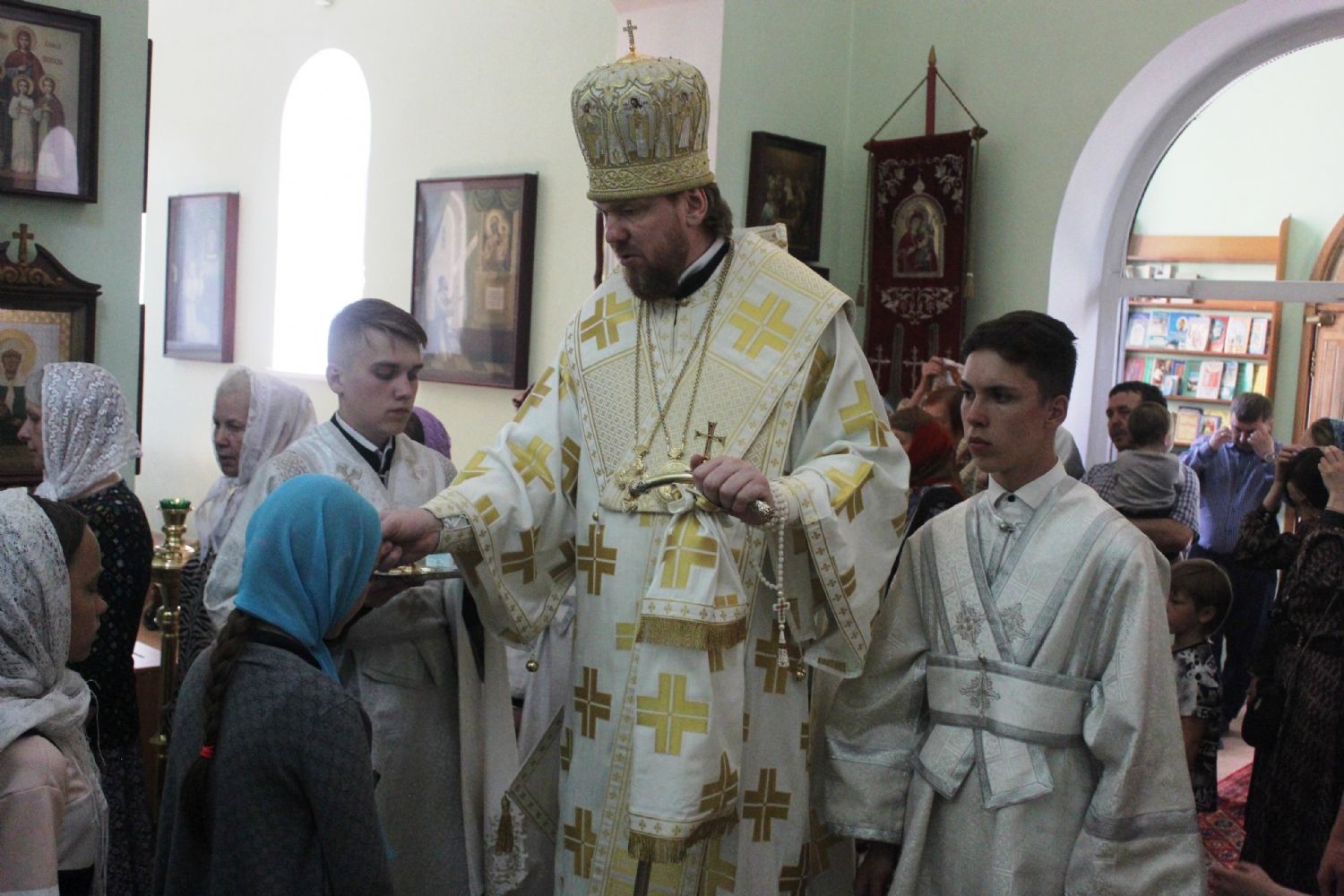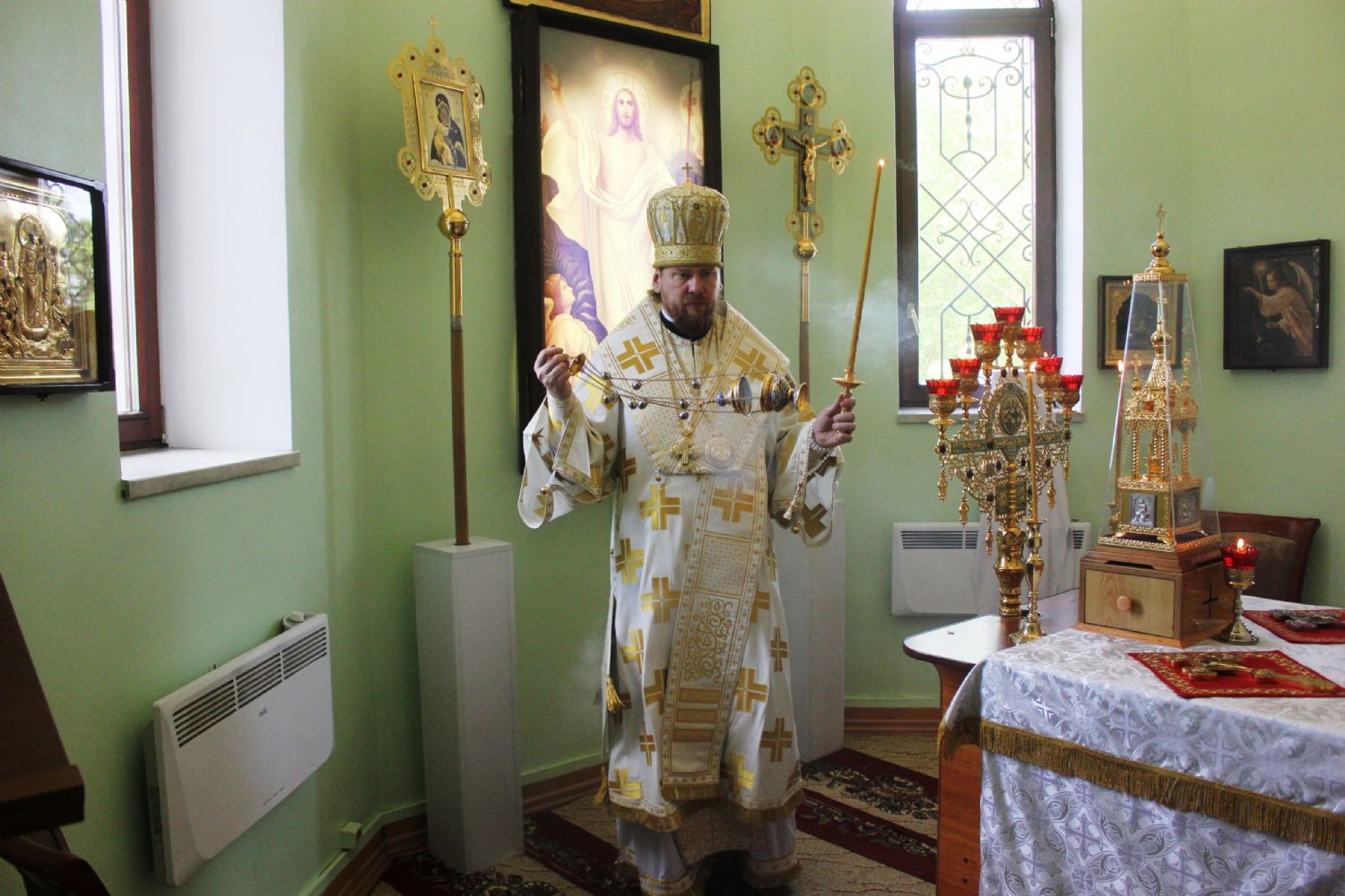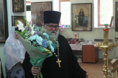 В завершение богослужения от имени клира и прихожан настоятель храма протоиерей Григорий Цуркан поздравил владыку с попразднством Вознесения Господня, поблагодарил за совместную молитву и преподнес ему букет цветов.