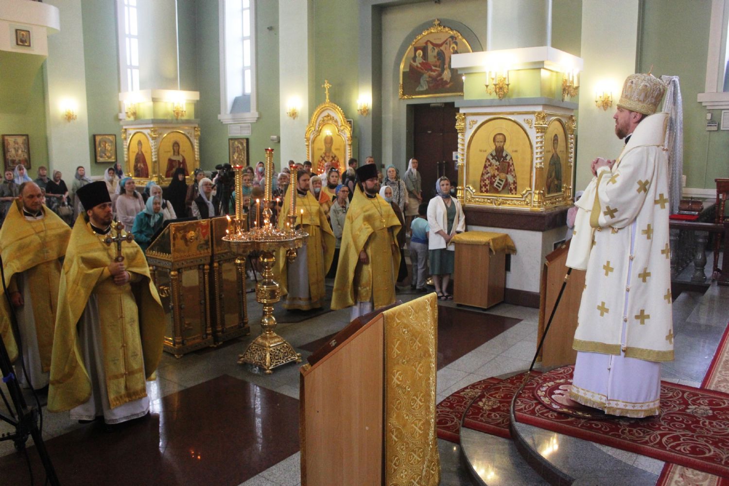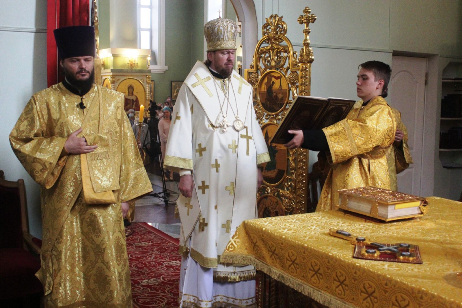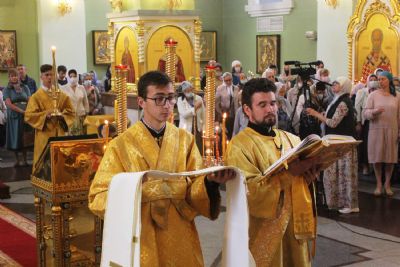 Его Высокопреосвященству сослужили: ключарь Покровского собора иерей Владимир Плотников, иерей Максим Точуков, клирик храма святителя Николая Чудотворца города Уссурийска иерей Глеб Журавлев, иерей Дионисий Ищенко.