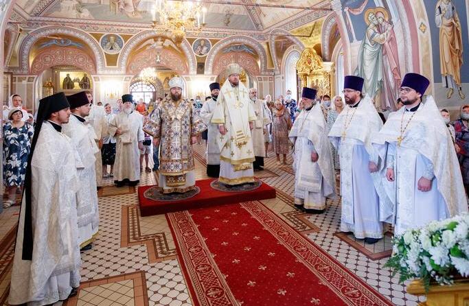 Саратов. 19 августа 2021 года, в праздник Преображения Господня, митрополит Саратовский и Вольский Игнатий и митрополит Владивостокский и Приморский Владимир совершили Божественную литургию в Свято-Троицком кафедральном соборе города Саратова.