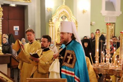 Его Высокопреосвященству сослужили: ключарь Покровского собора иерей Владимир Плотников, игумен Антоний (Каменчук), иерей Максим Точуков, иерей Олег Селезнев, иерей Дионисий Ищенко.