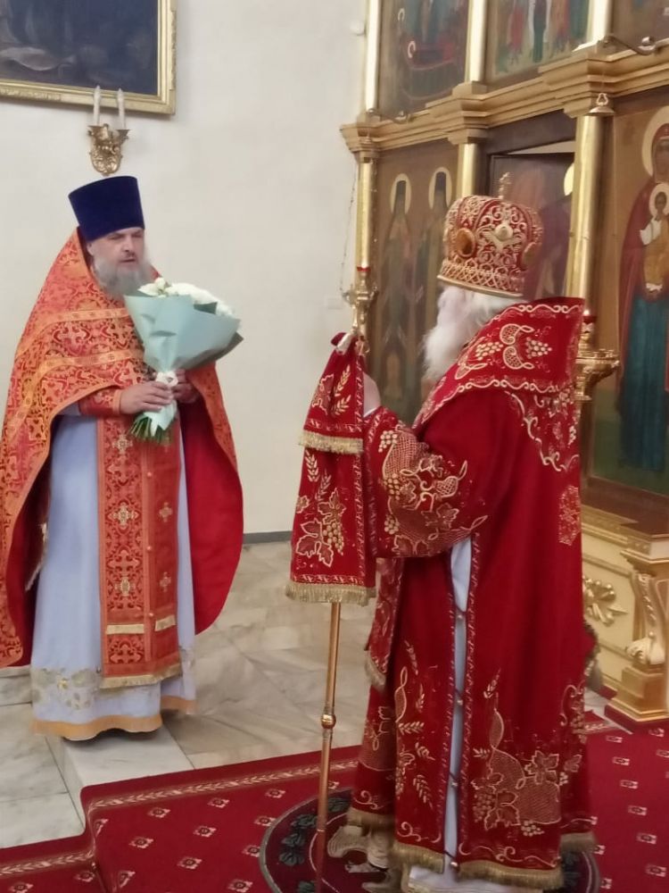 Со словами поздравления к митрополиту Вениамину обратился ключарь Никольского собора протоиерей Александр Талько и преподнес букет цветов.